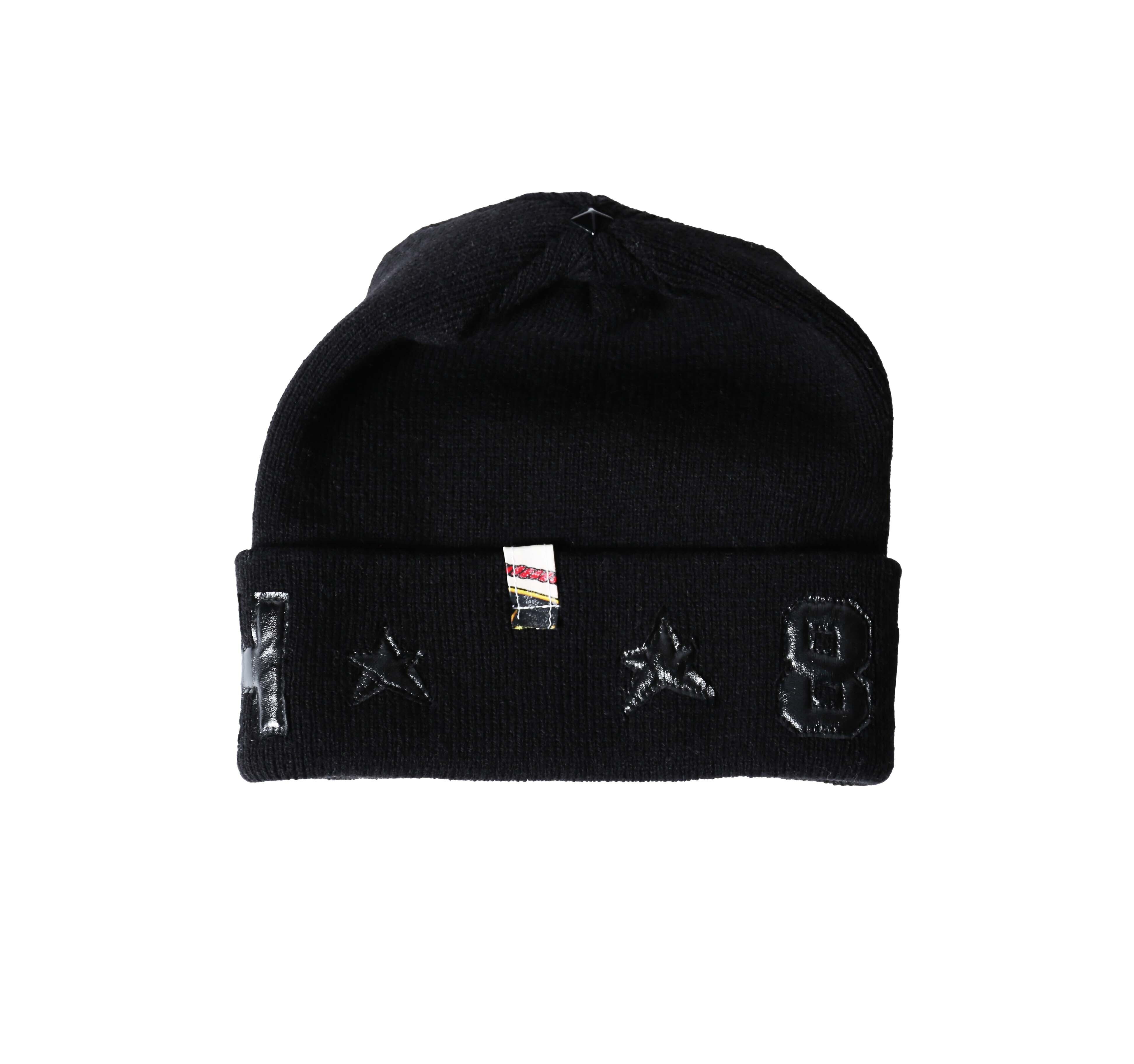 折り返し部分に文字ロゴの入ったニットキャップ。カジュアルで使いやすいデザイン。