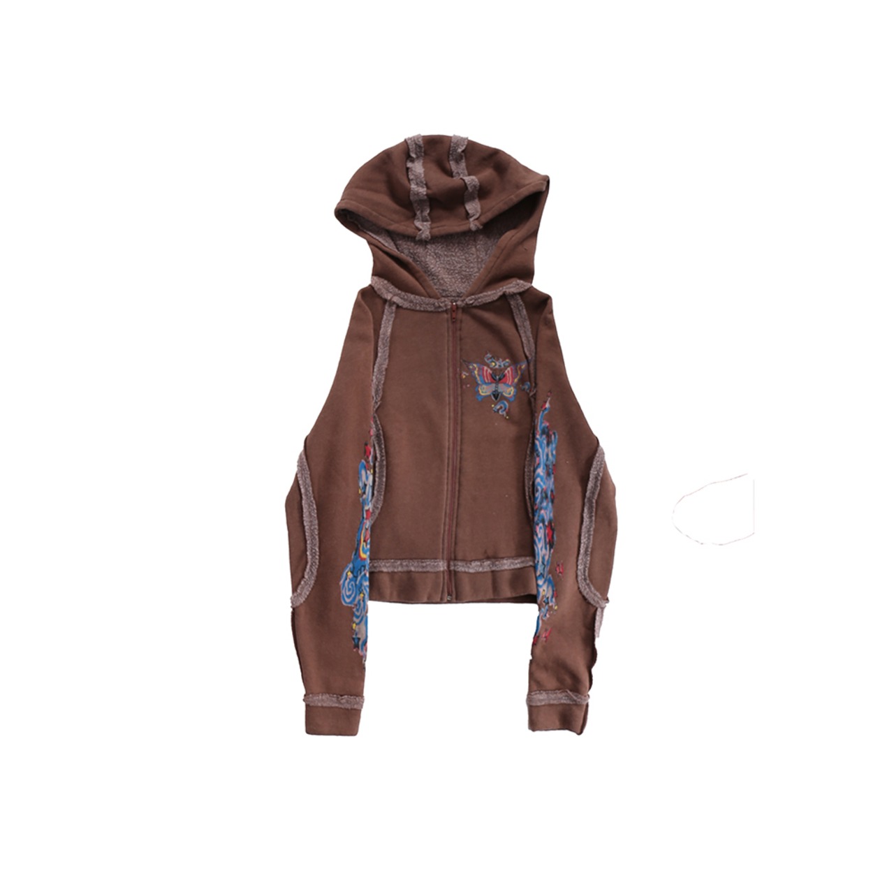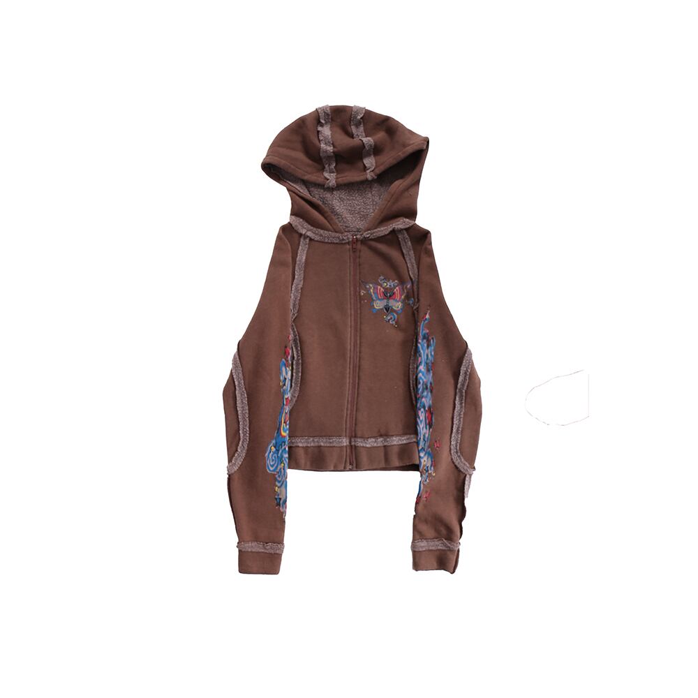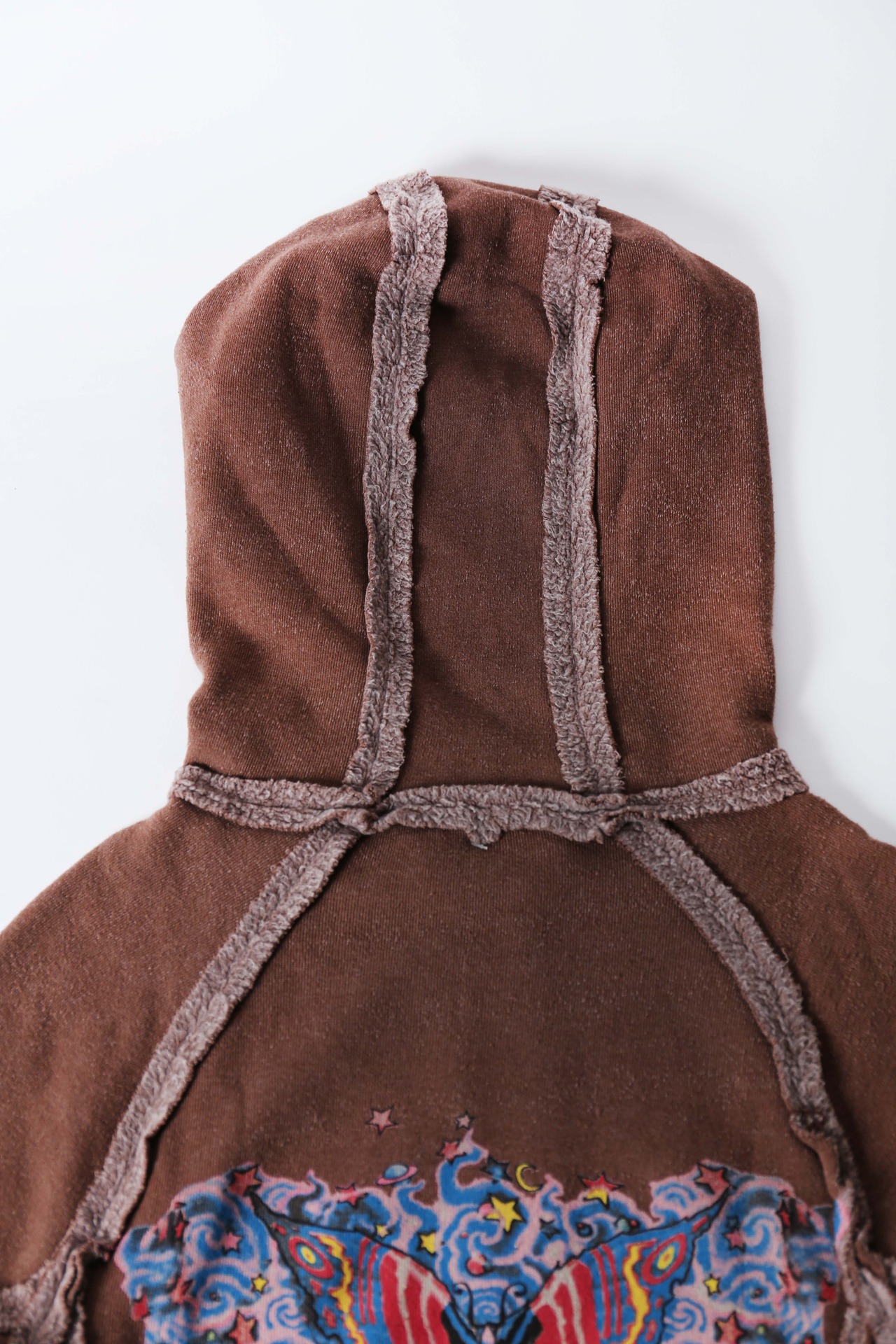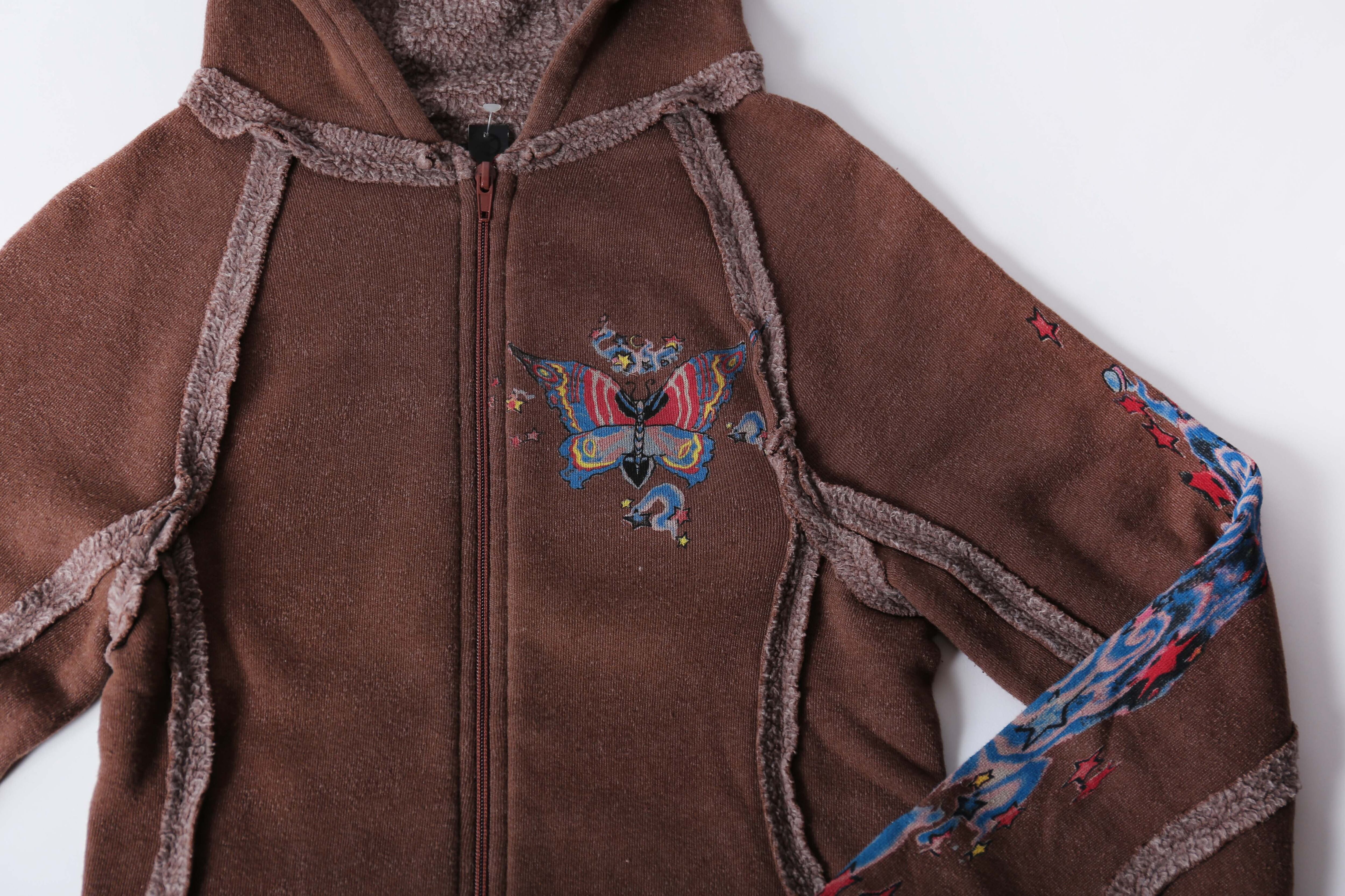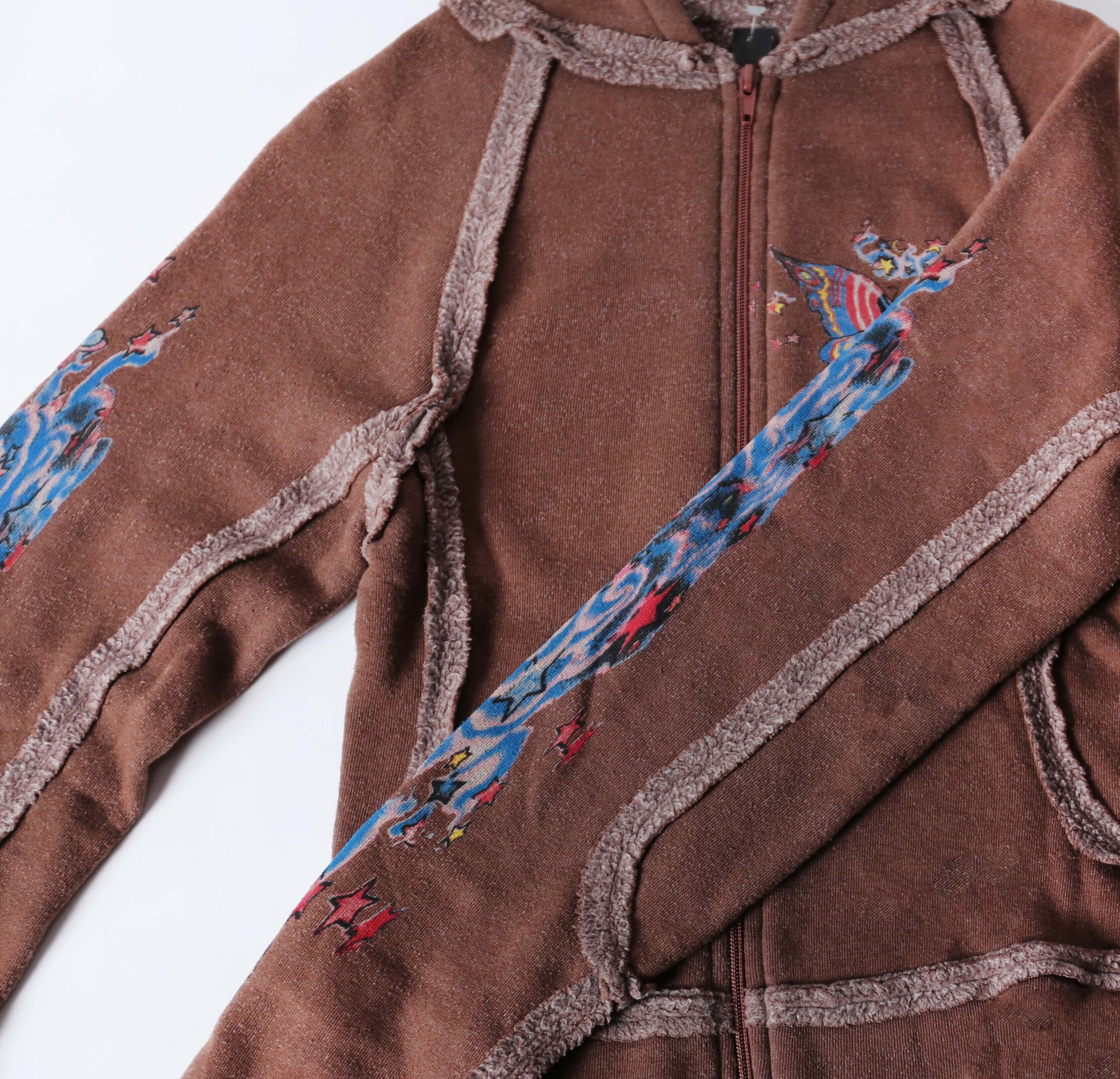 柔らかなフリース素材のパーカーにサイケデリックなデザインが袖、胸、背面にデザインされたインパクトのある一枚。サイズはコンパクトなのでインナーやノースリーブの上からご着用ください。