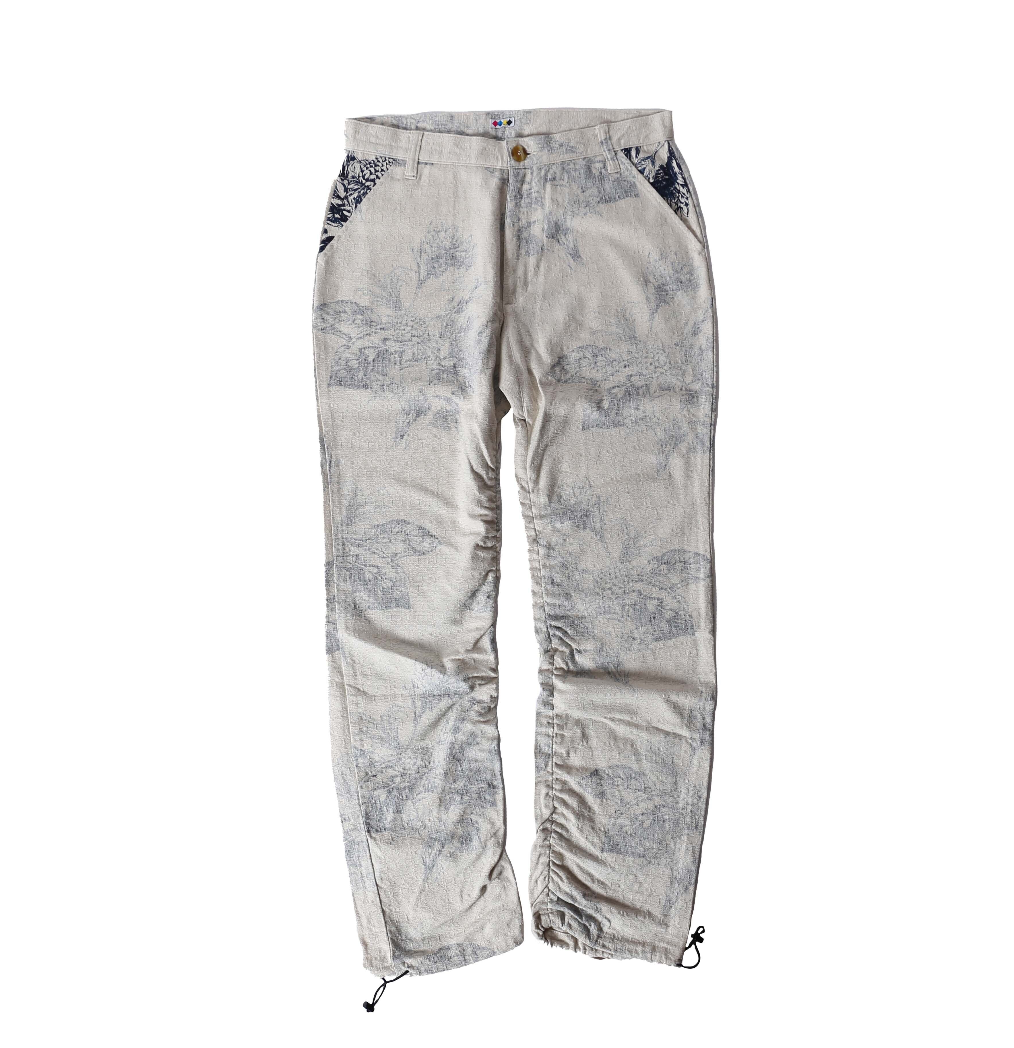 ボタニカル柄のリネン生地をあえて裏側にして製作されたパンツ。ポケットのところだけ表地で、繊細な柄のニュアンスを楽しんでいただけます。裾は絞ることができるので、合わせる靴によって、お好きなスタイリングをお楽しみください。遠くから見ると白いパンツ。近くで見るとうっすらと浮かび上がる柄を楽しめる魅力あふれる一枚です。