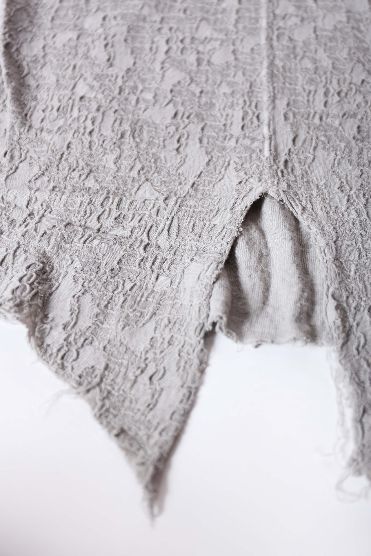 グレーのレースが上品なフィッシュテールのタンクトップ。フィッシュテールなのでトップスの下から覗かせるような短丈のものを合わせるコーディネートもしてみてください。