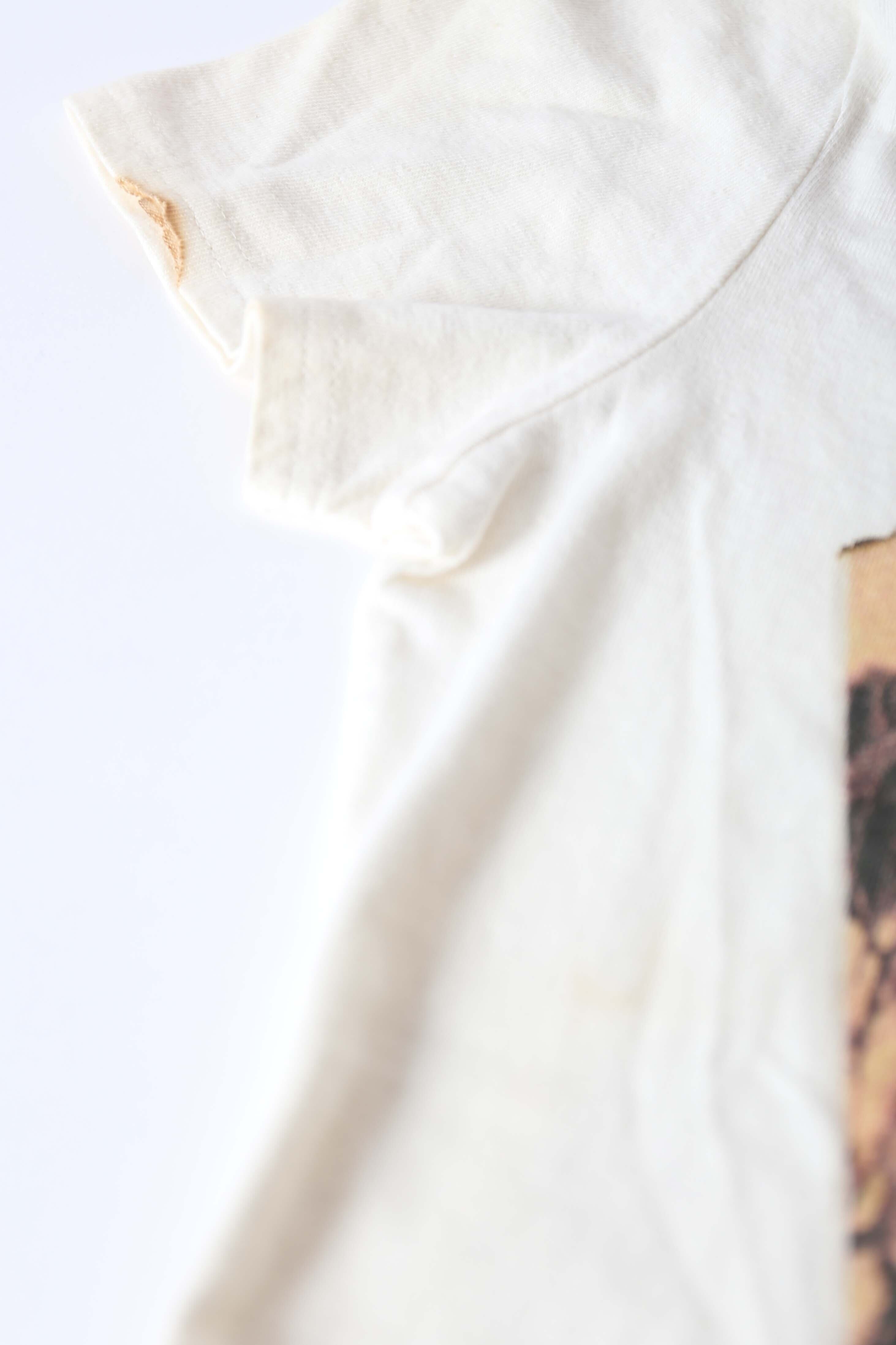 焼かれたようなグランジ感が特徴のTシャツ。リアルに焼かれた生地感を演出しておりますので独特なシミのようなものもありますが、全てグランジ加工によるものです。
