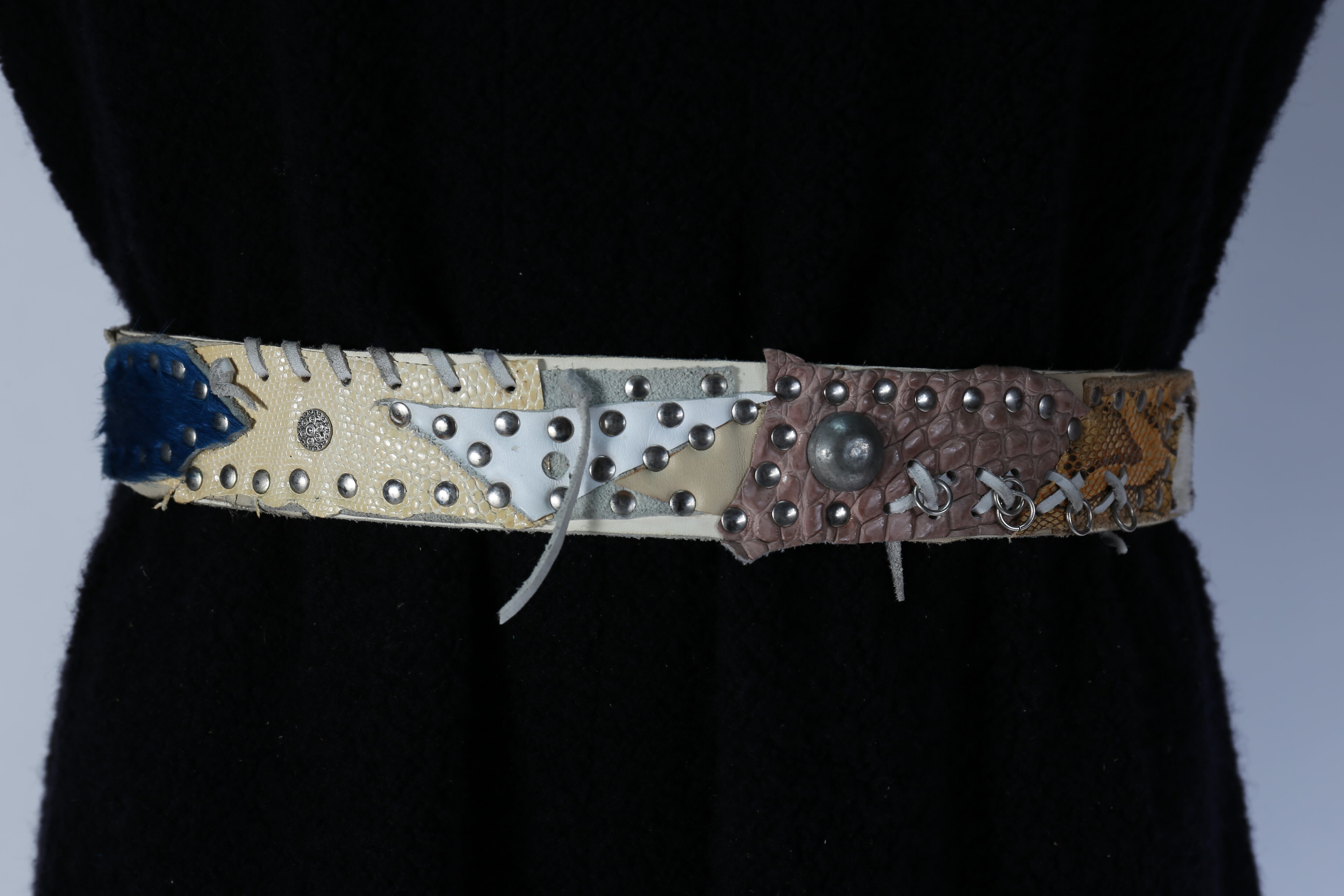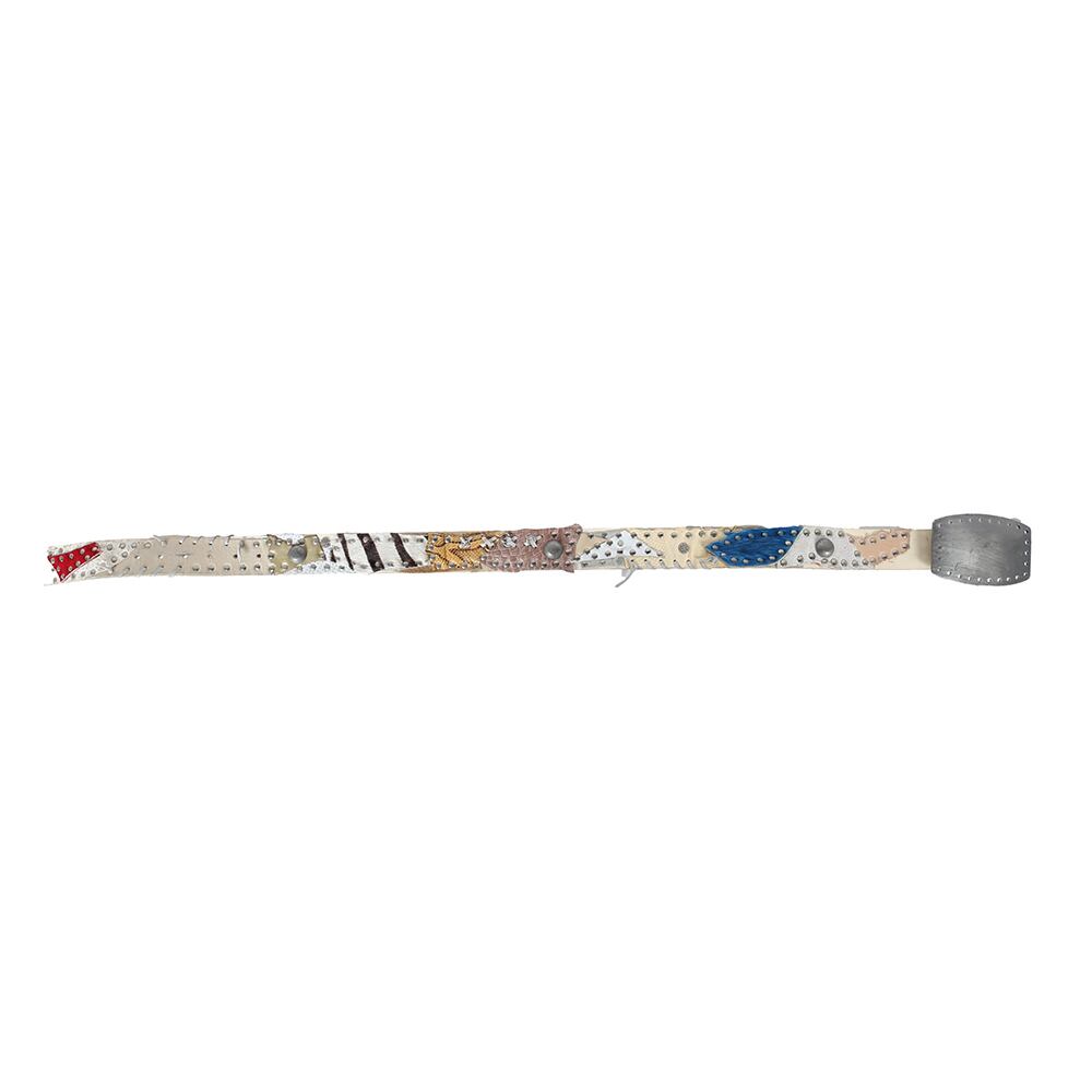 アーティスティックなレザーベルト。つぎはぎされたレザーとスタッズが全体に施されており、とても個性的なアイテムです。カラフルな柄物のアイテムと合わせたり、シンプルなトータルコーディネートの主役にも是非お使いください!