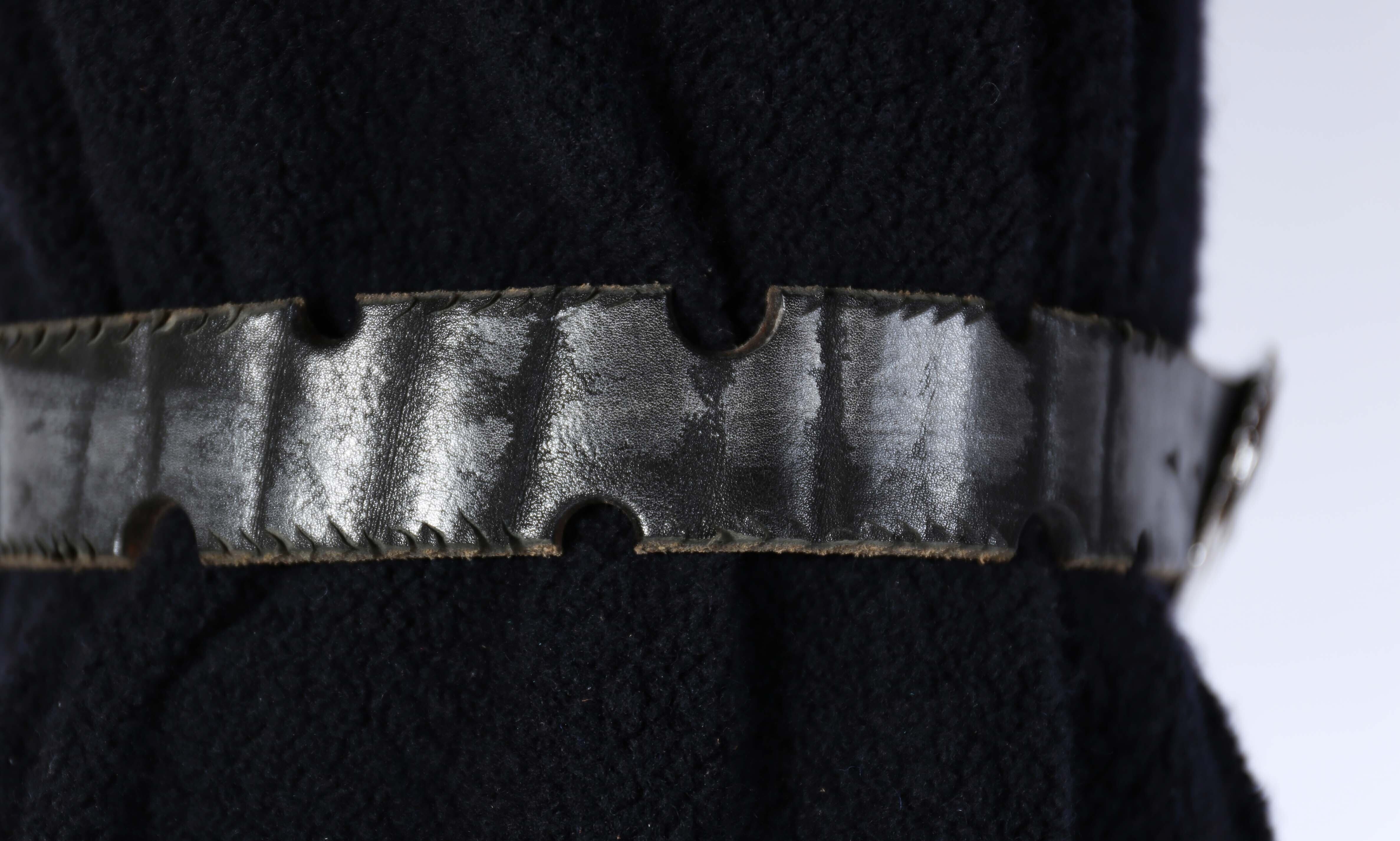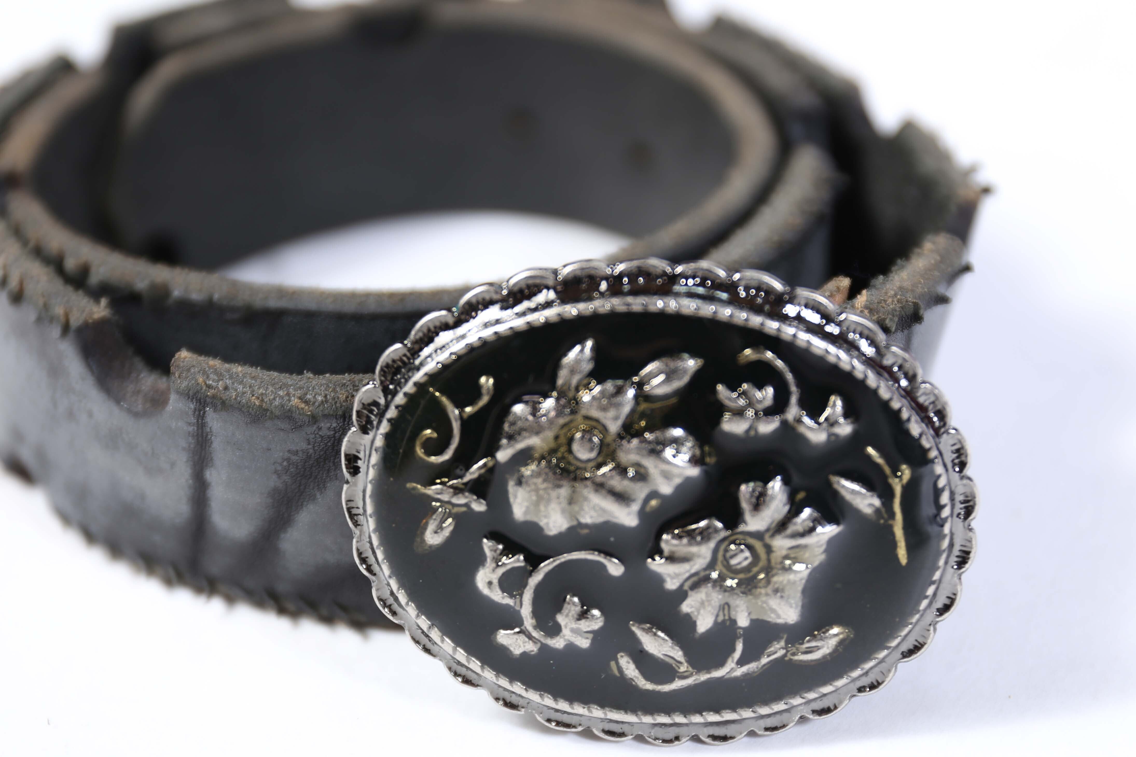 バックルに花のレトロなデザインが施された幅太めのベルトです。ベルトには虫食いのようなダメージデザインが多数あり、ベルトとして純分に主役になってくれるアイテムです。