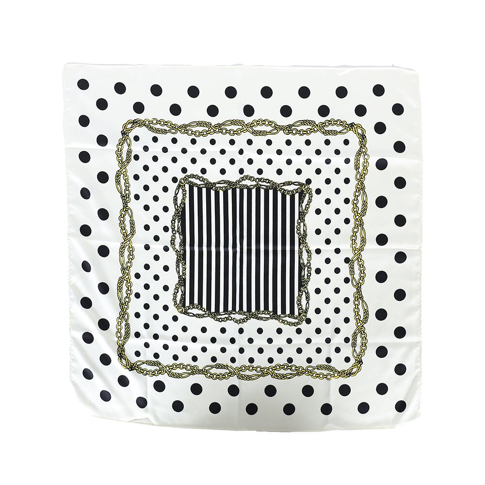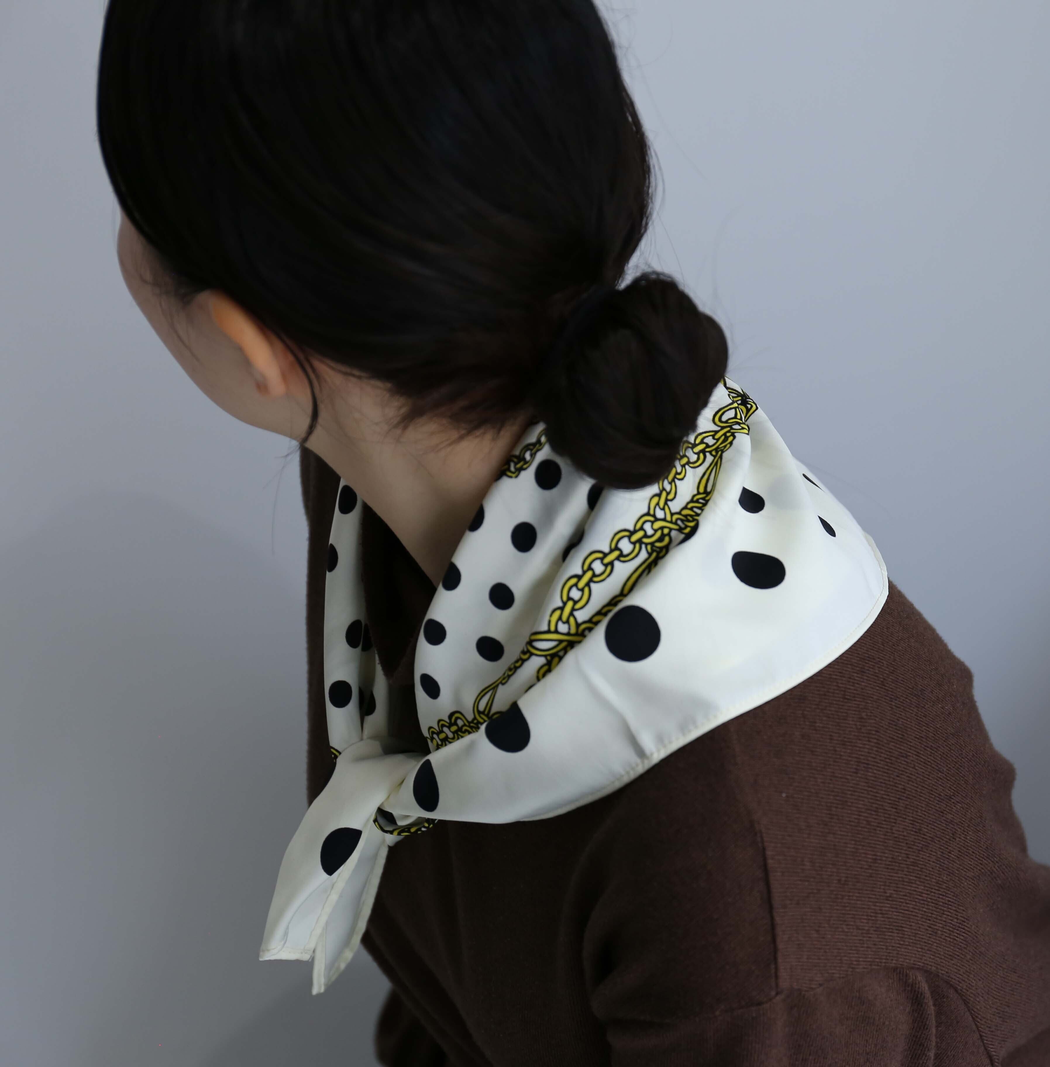 品のあるデザインスカーフ。どんな、たたみ方をしてもデザインが十分楽しめる計算されたデザインです。服やカバン、ヘッドなど。幅広くお使いください。