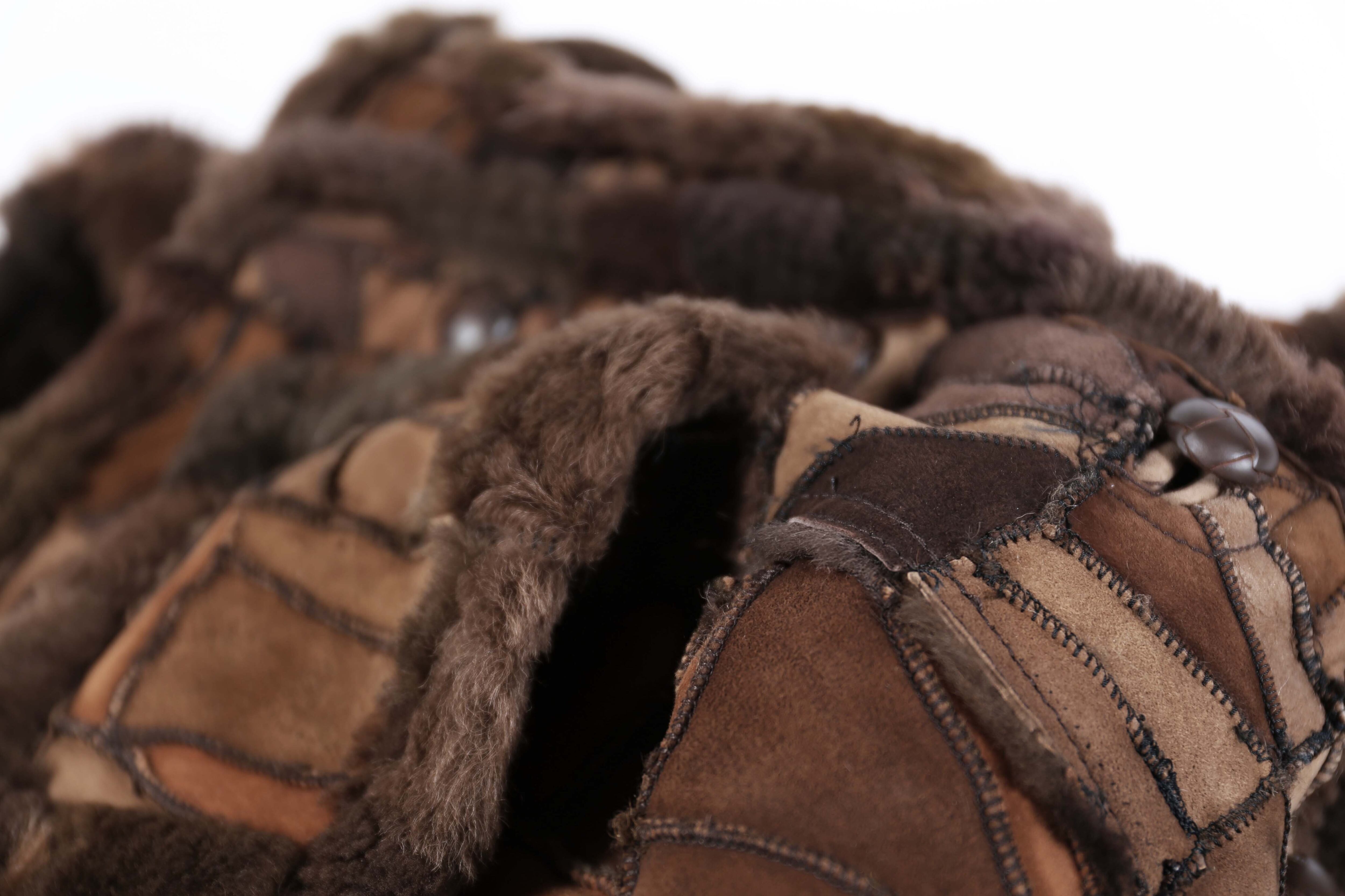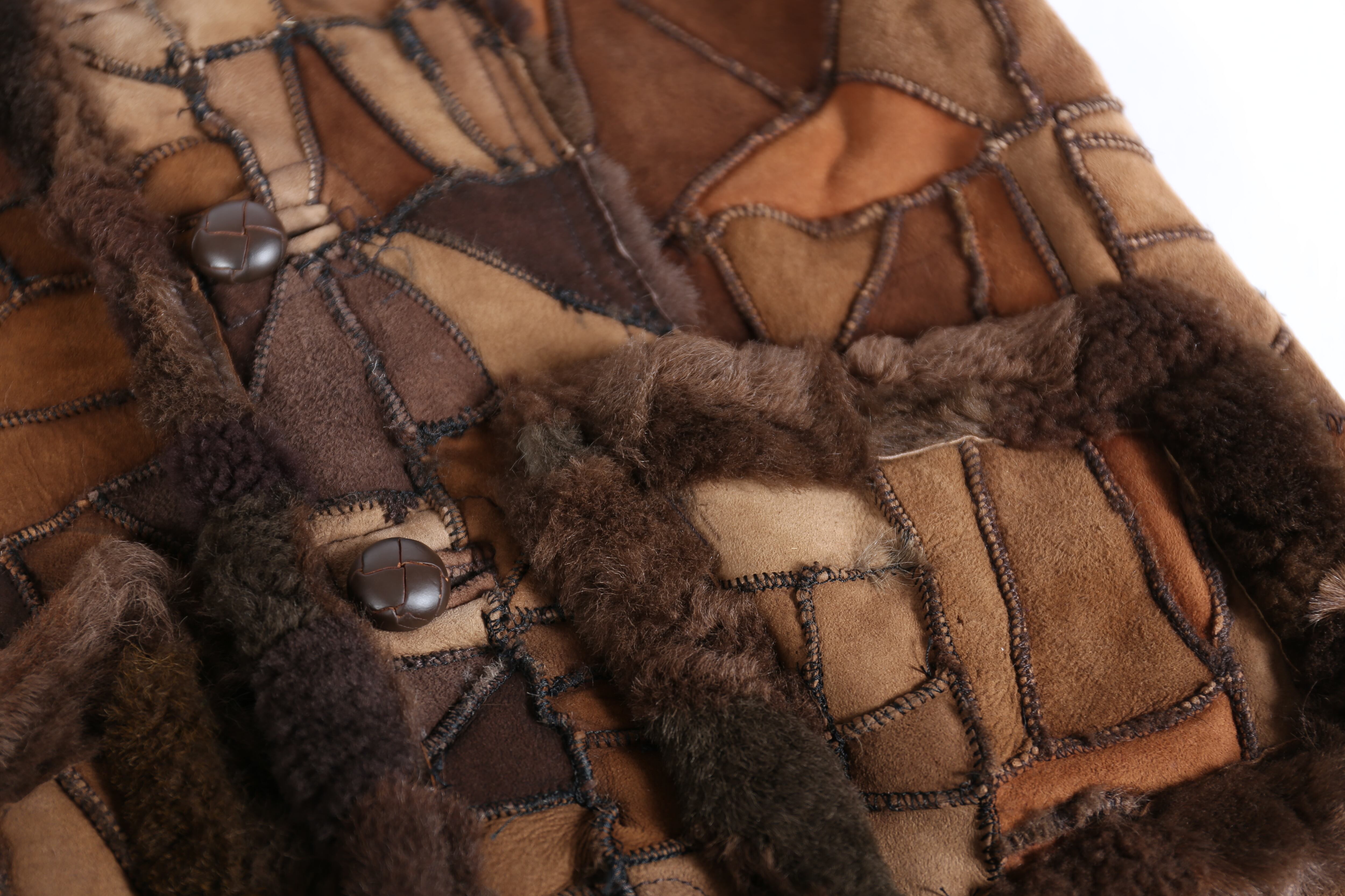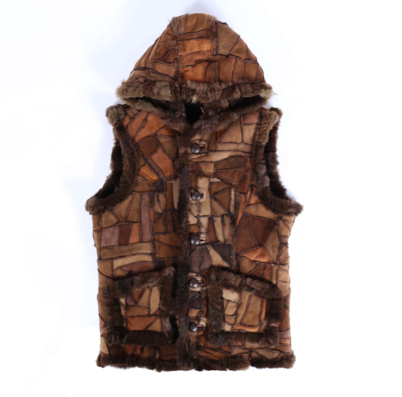 とても細かい、ムートンのつぎはぎベストです。ファーがついた温かい使用で、非常に繊細な技術で作られた難しいパターンのベストは、使い込むうちにより柔らかく馴染んできます。コンパクトなサイズなので肌に密着してとても温かいです。