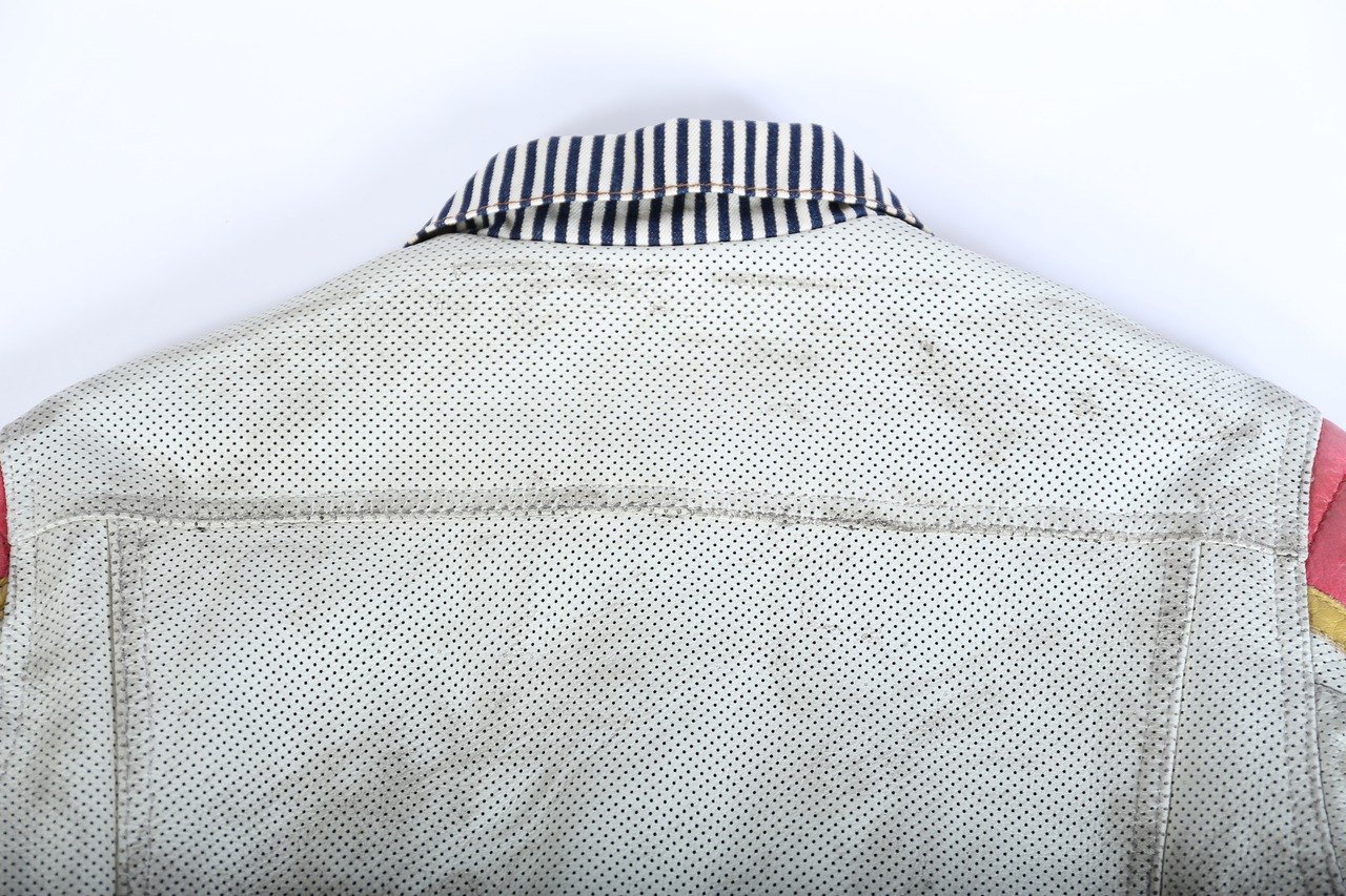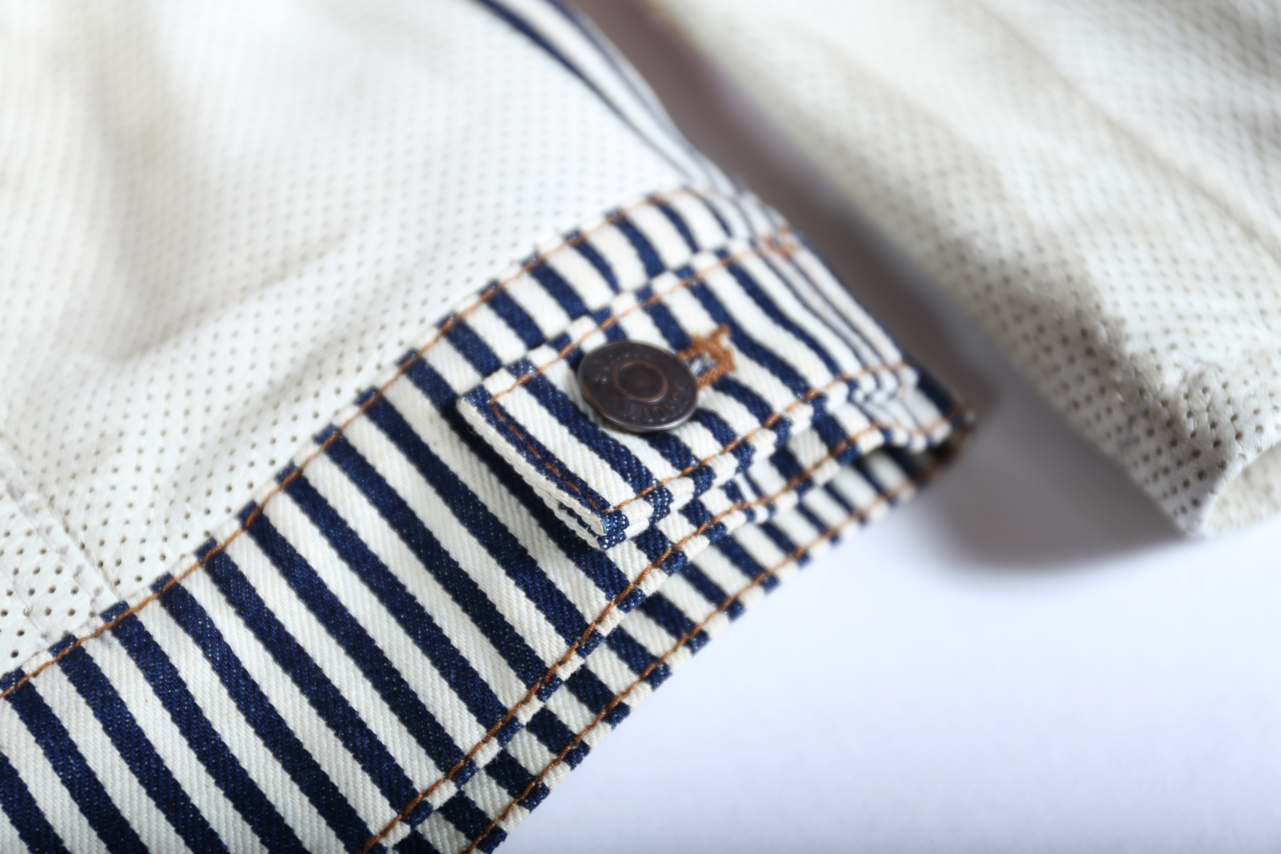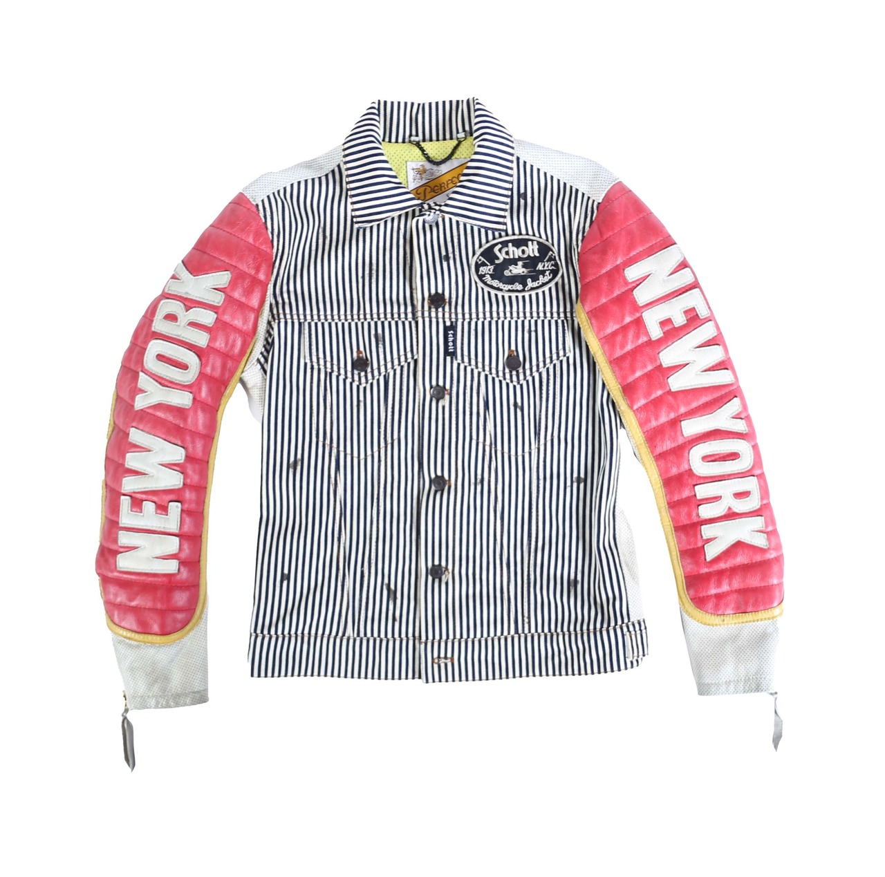 かなりユーズド感のある、ジャケット。スリーブ、ボディーとどの角度から見ても個性的なデザインを楽しんでいただけます。あえてのグランジ感を楽しんでいただくために生地やレザーにリアルなデザインが施されております。1着でビンテージ感や、アメリカンカジュアルをお楽しみいただけます。レザー、デニムとさまざまな素材のコンビとなっておりますので変化の出る、コーディネートをお楽しみください。