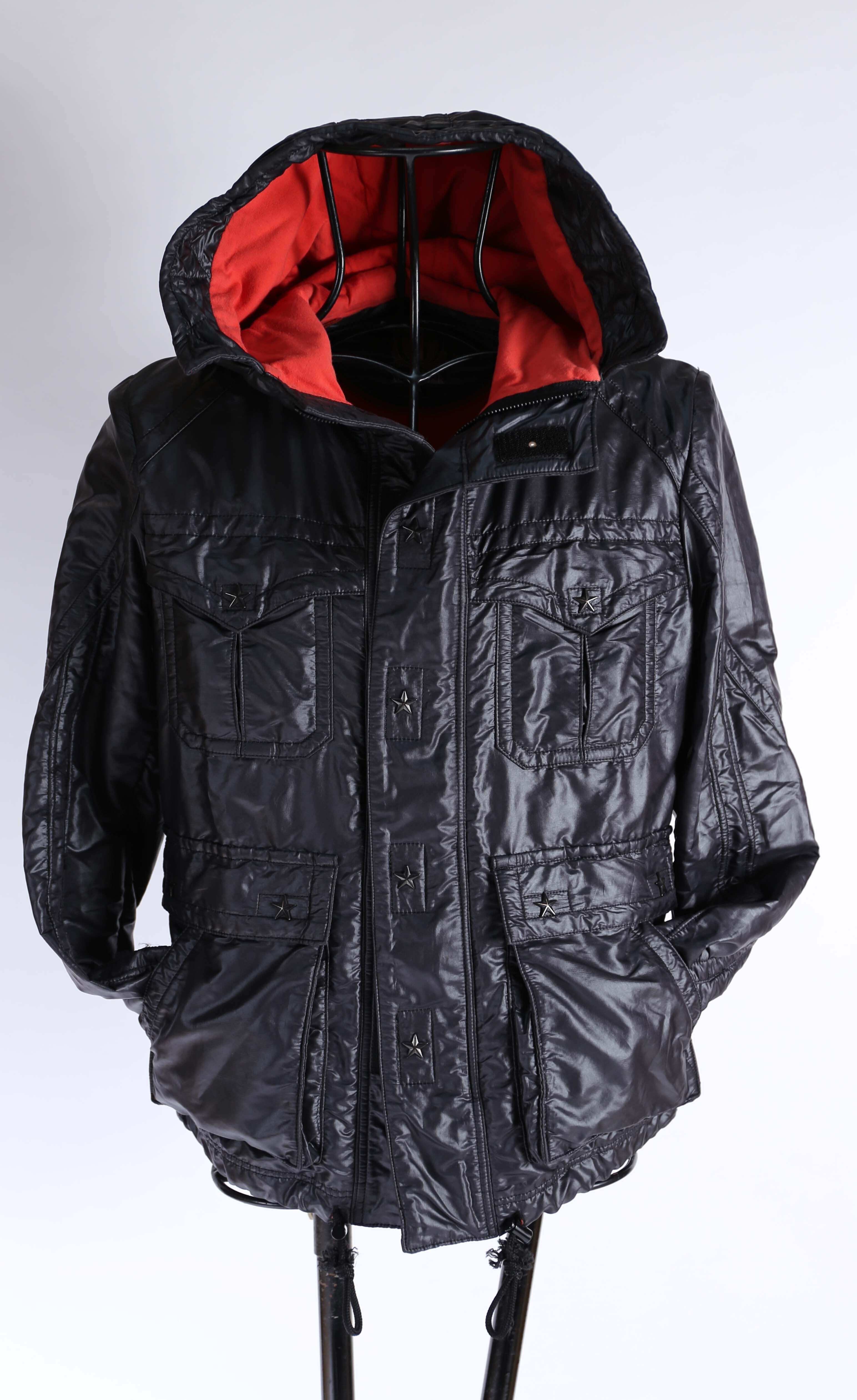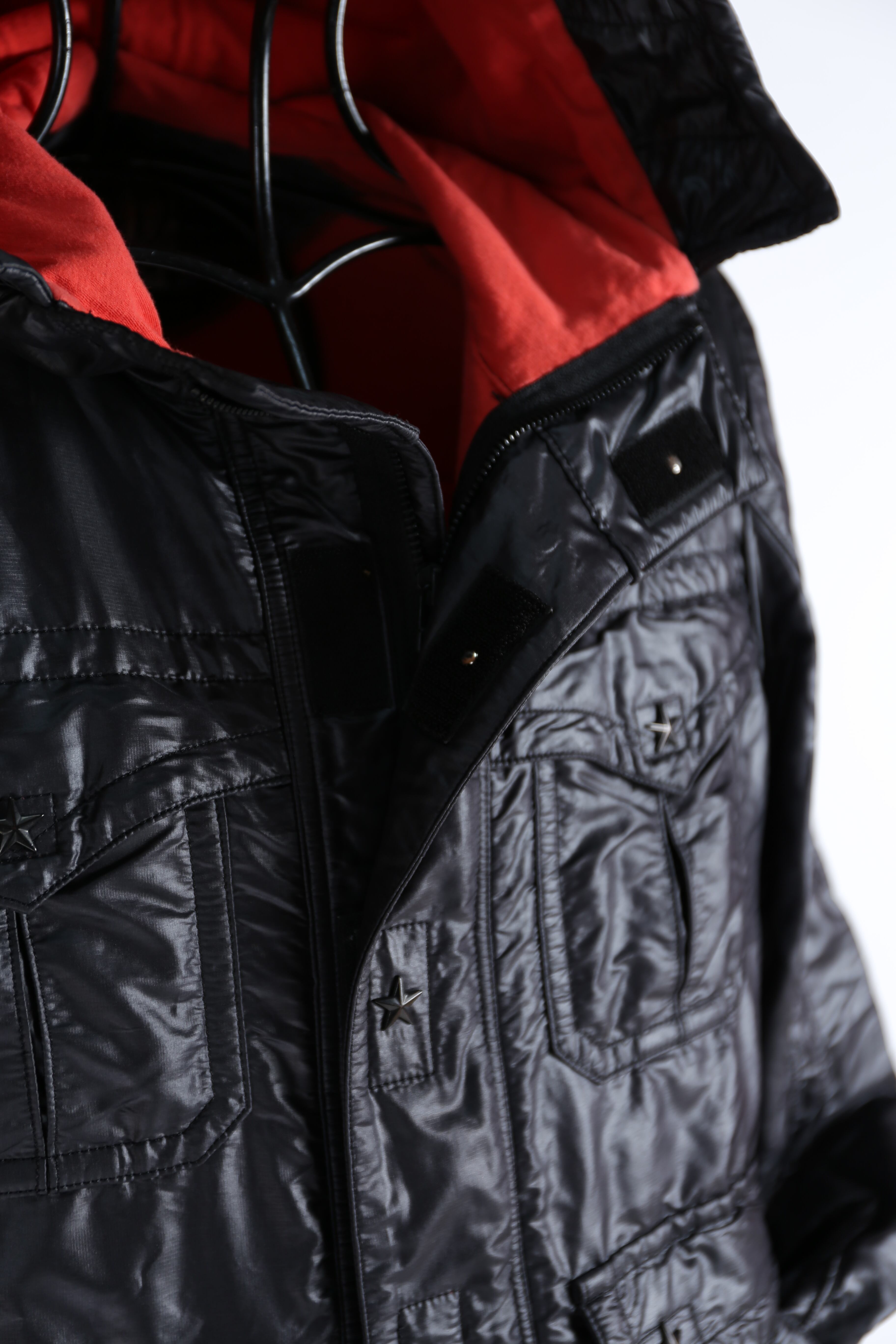 光沢のあるブラック生地は真っ黒ながらも光沢によって黒より、軽やかでスポーティーな印象です。ポケットも多くついていますのでアウトドアやレジャーにも活躍します。生地はそこまで分厚くありませんのでライトアウターとしてのご使用ください。