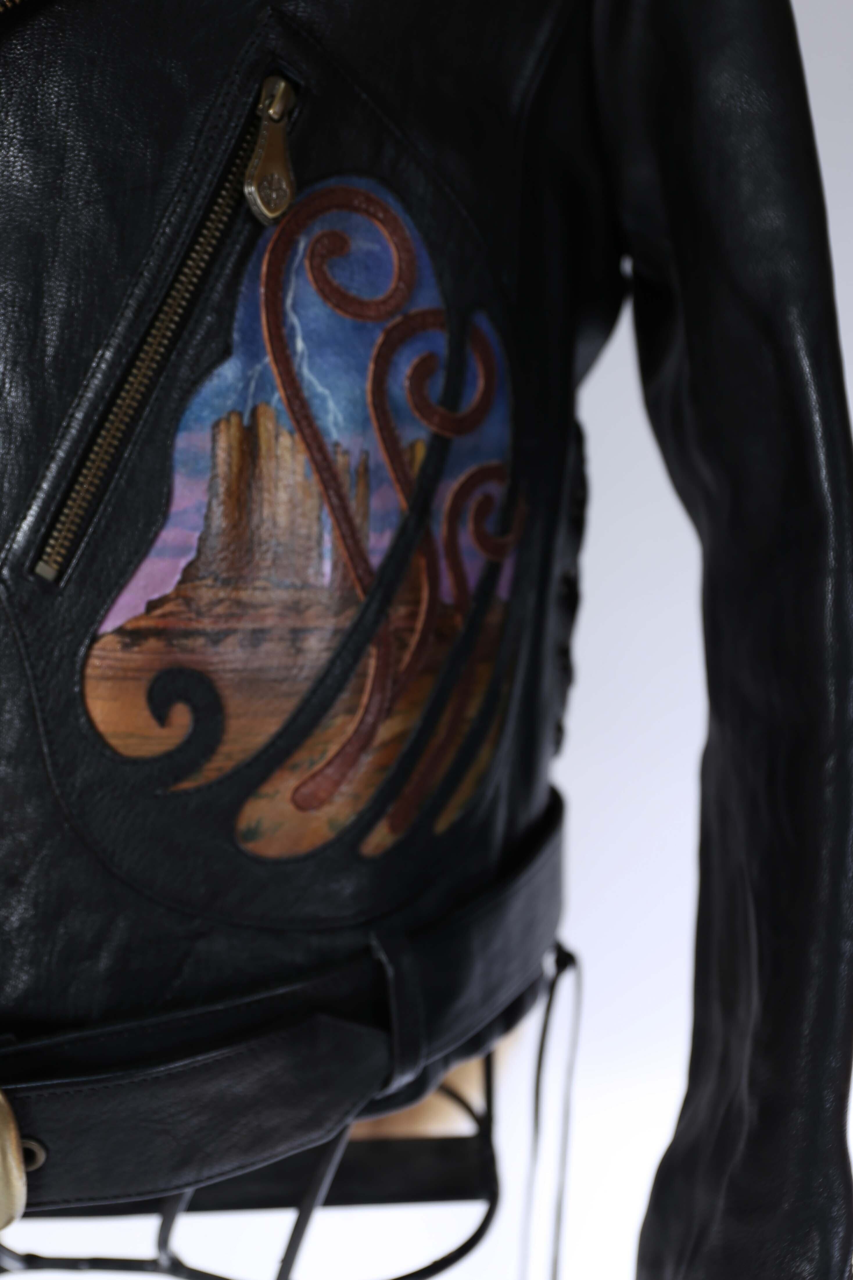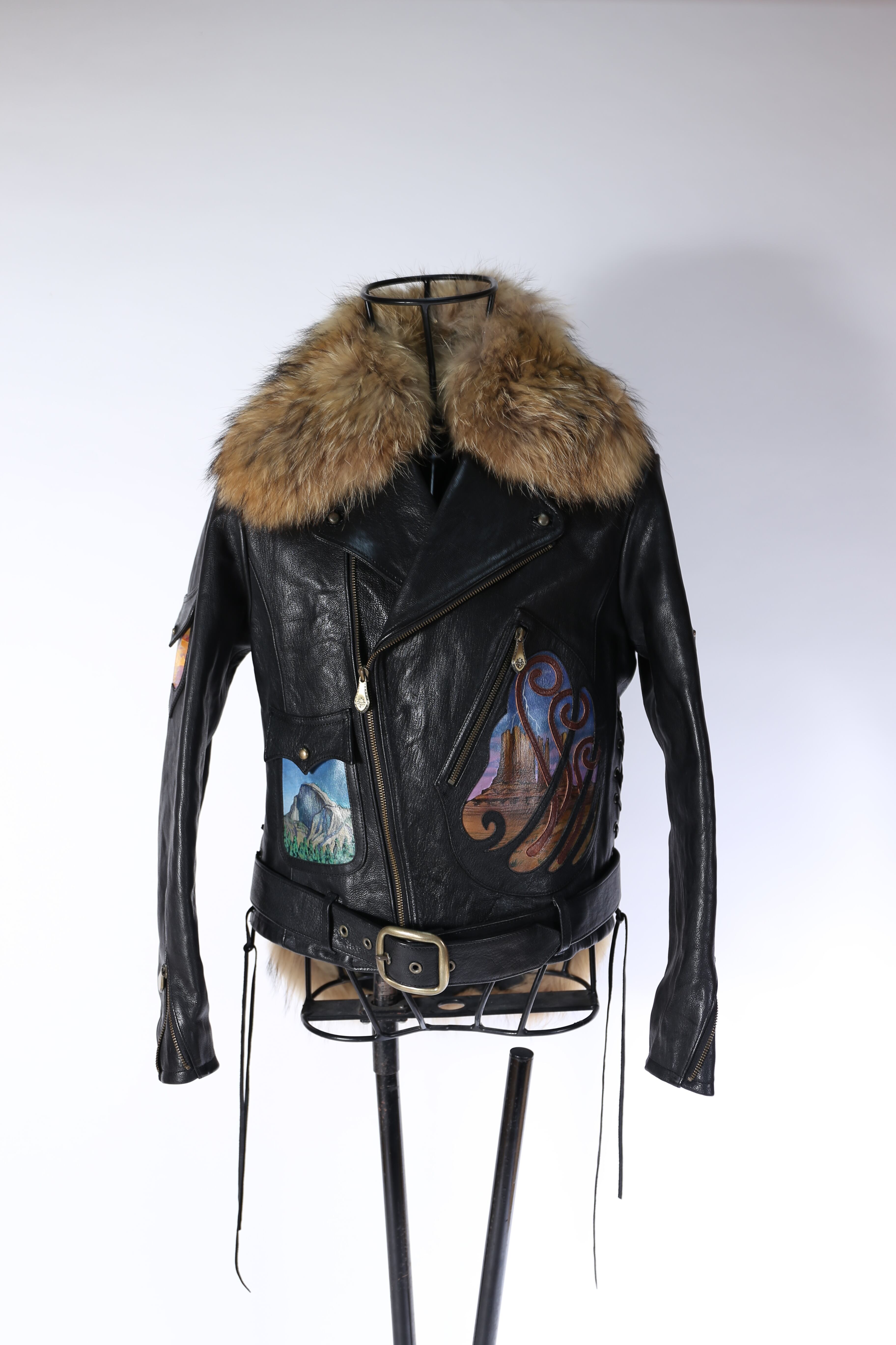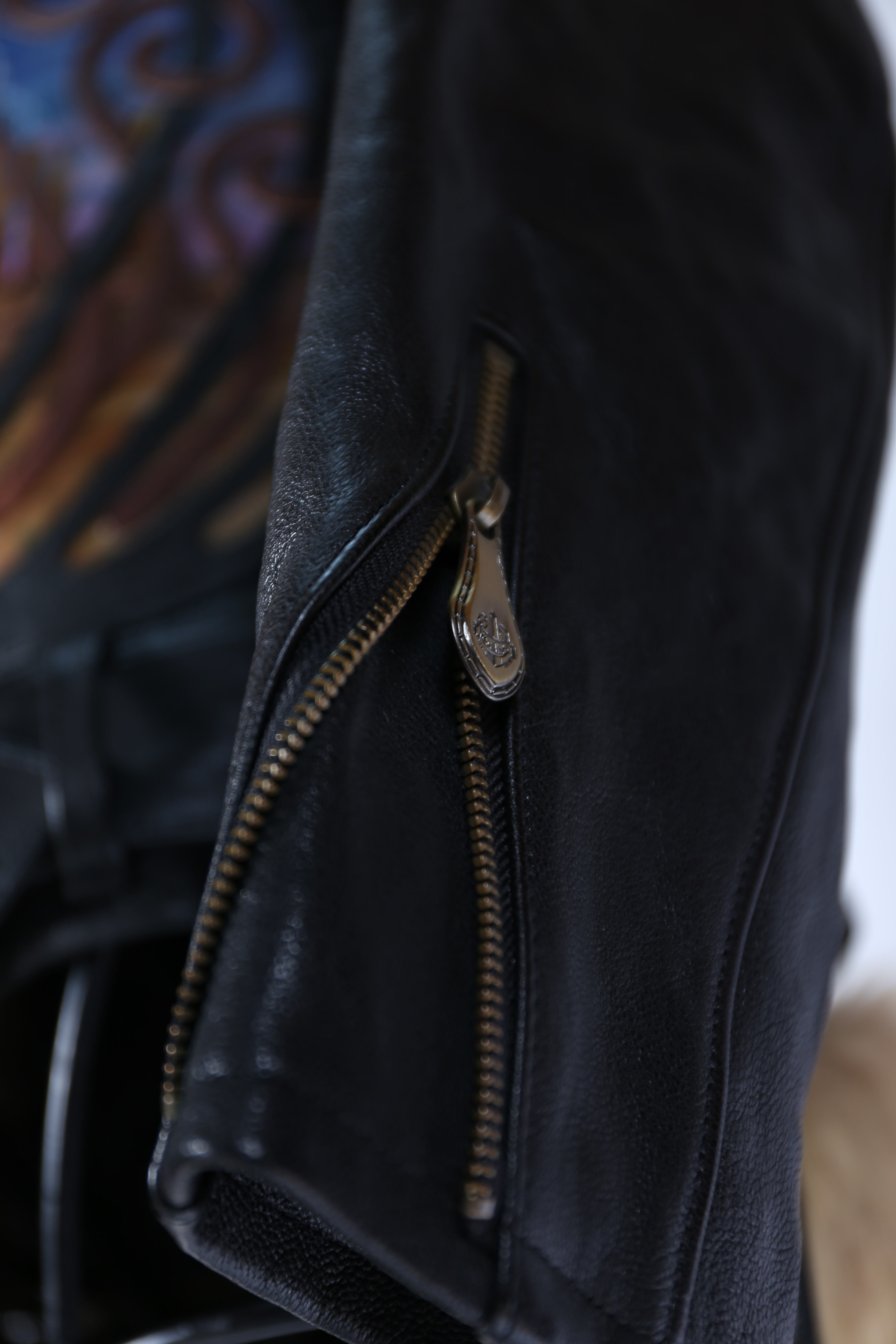 オベリスクの美しいデーシックデザインのレザージャケットに、デザイナー手書きのアーティスティックな絵画が描かれています。絵画と有機的な形のレザークラフトから、デザイナーの強いこだわりを感じられます。