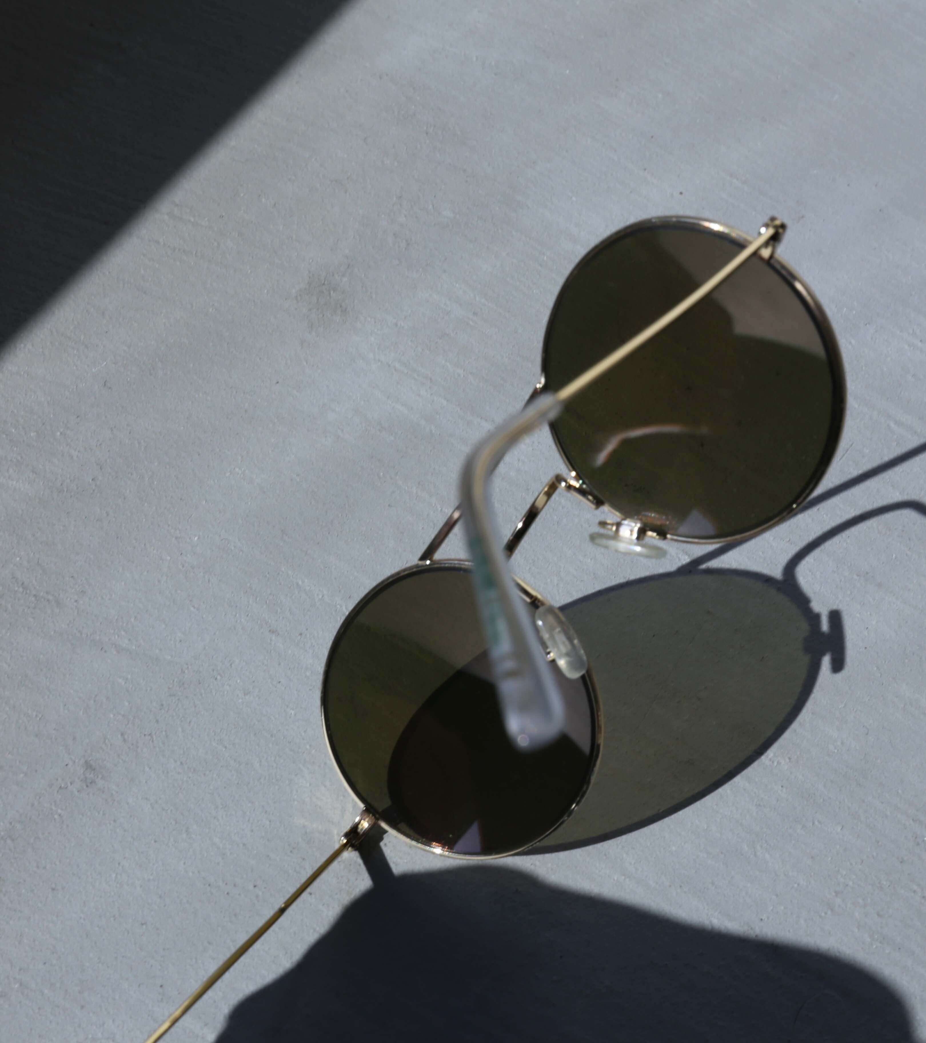 シャープでエッジィなサングラス。丸いレンズ部分もよく見ると若干顔に馴染むような歪んだ形をしており、丸いレンズの形の中に細なデザインのこだわりを感じられます。透け感のすくないレンズなのでアンパクトのある印象になります。レンズ以外はかなりシャープで、耳にかけやすうように耳にかける部分には滑りにくい素材を使用しているのでフィット感もあります。