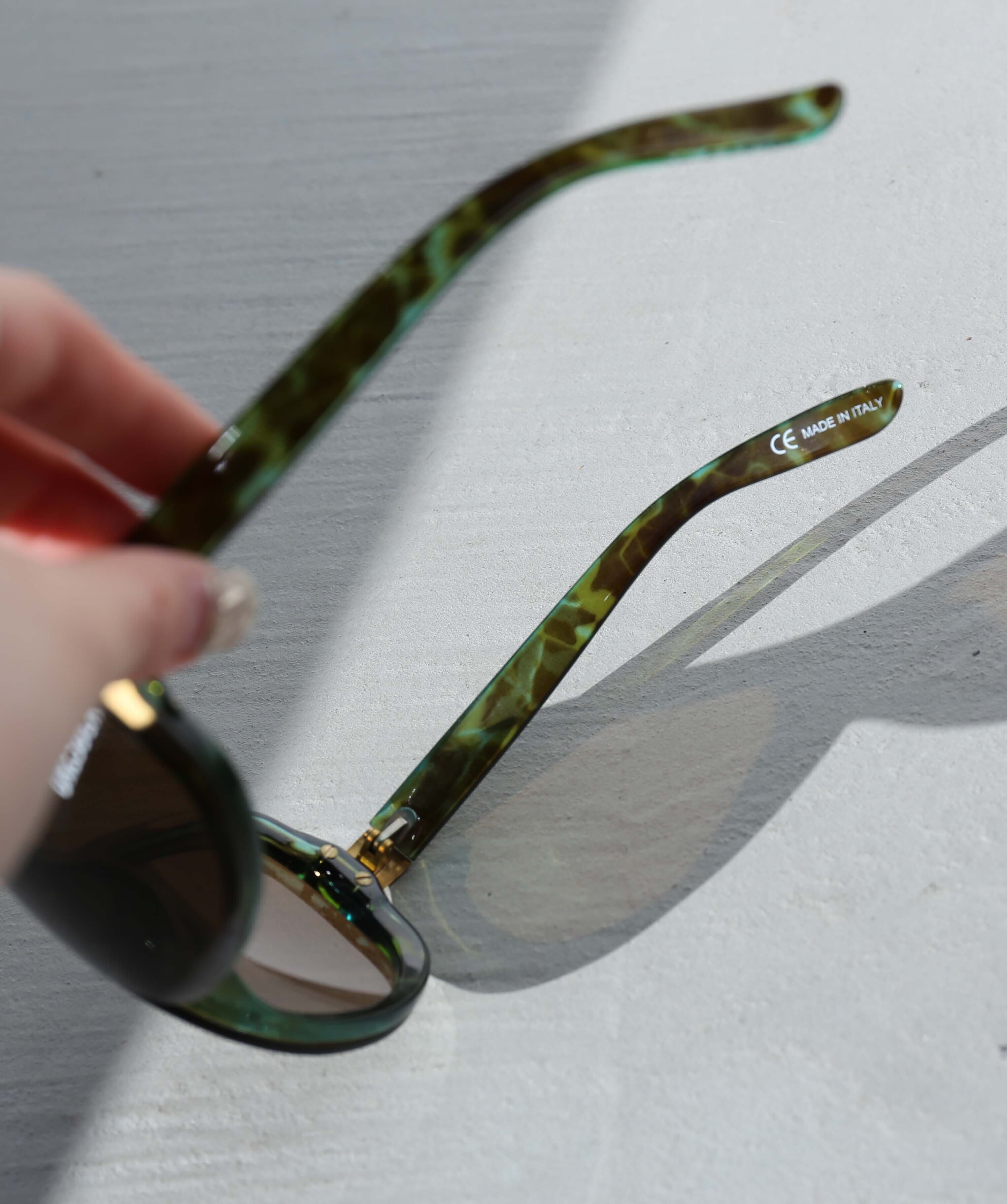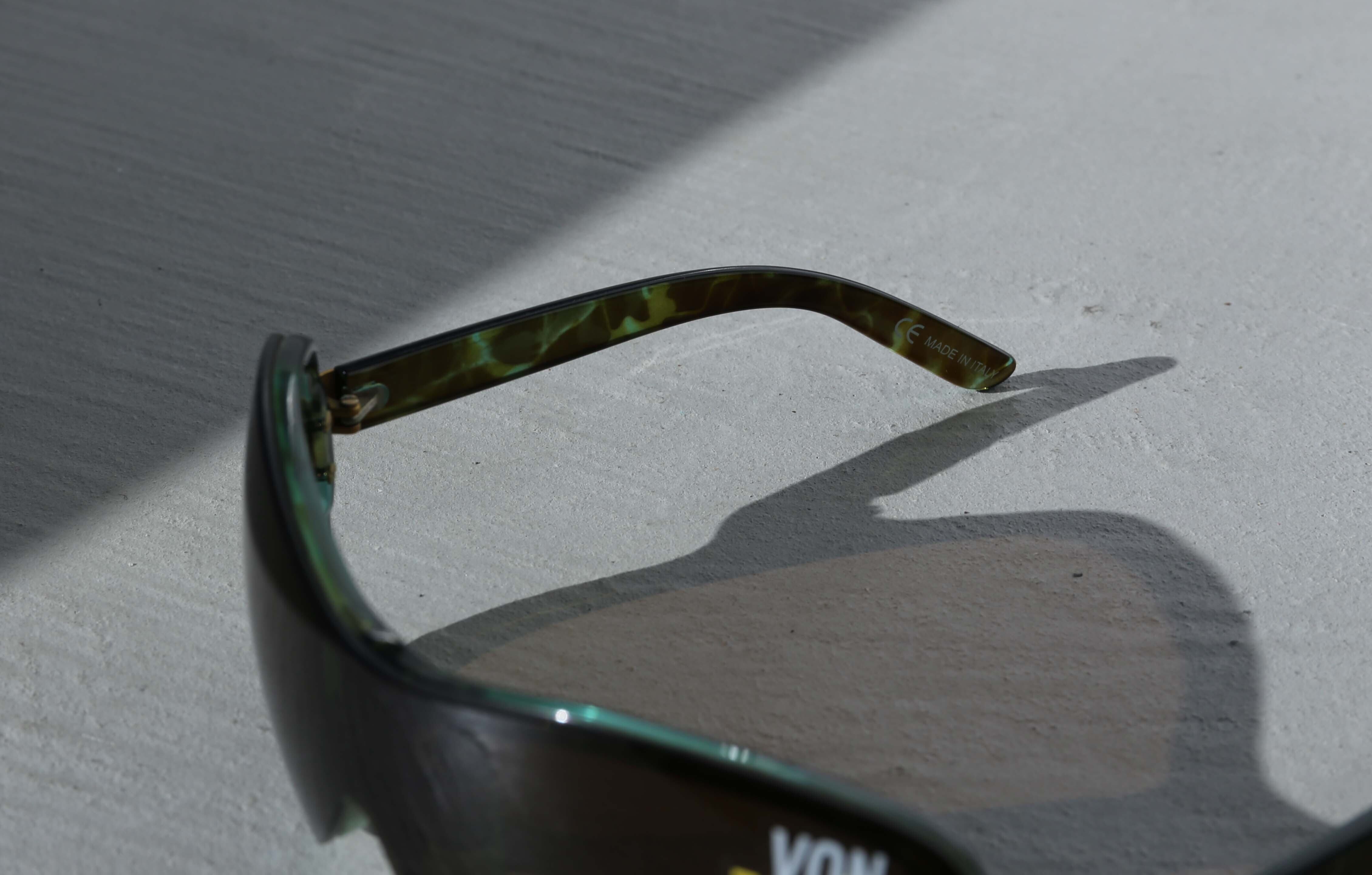 光に透けるグラデーションが美しいサングラス。レンズ部分も大きくしっかりを紫外線を防ぎます。高級感のあるデザインの中にメタルパーツやレオパード柄のインパクトがエッジィなサングラスです。