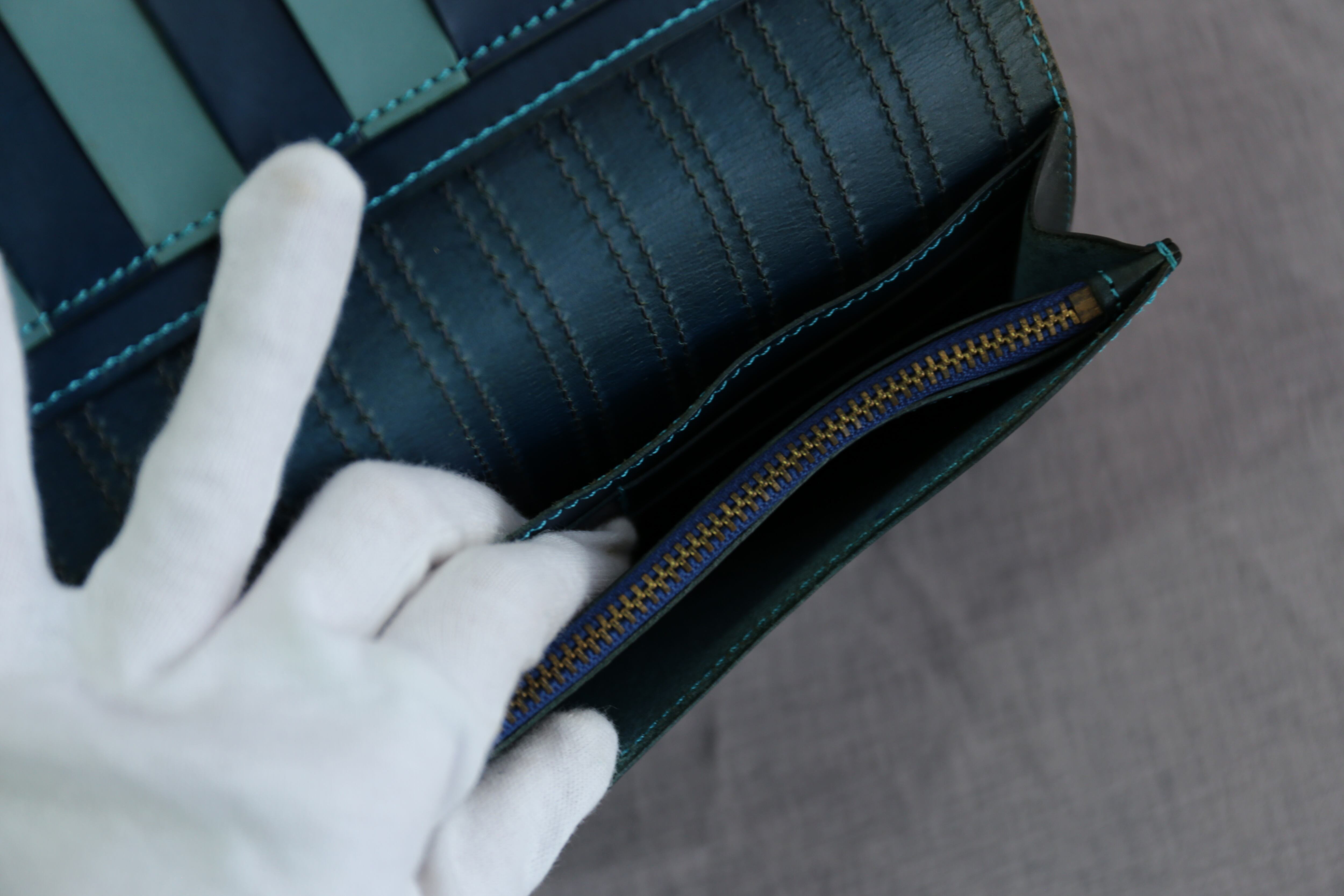 レザーの切り替えでデザインができている、手のこった一枚。色違いのグリーンのコントラストが美しいデザインです。皮を別々で染めたものをさらに再構築した非常に手の込んだおつくりになっています。