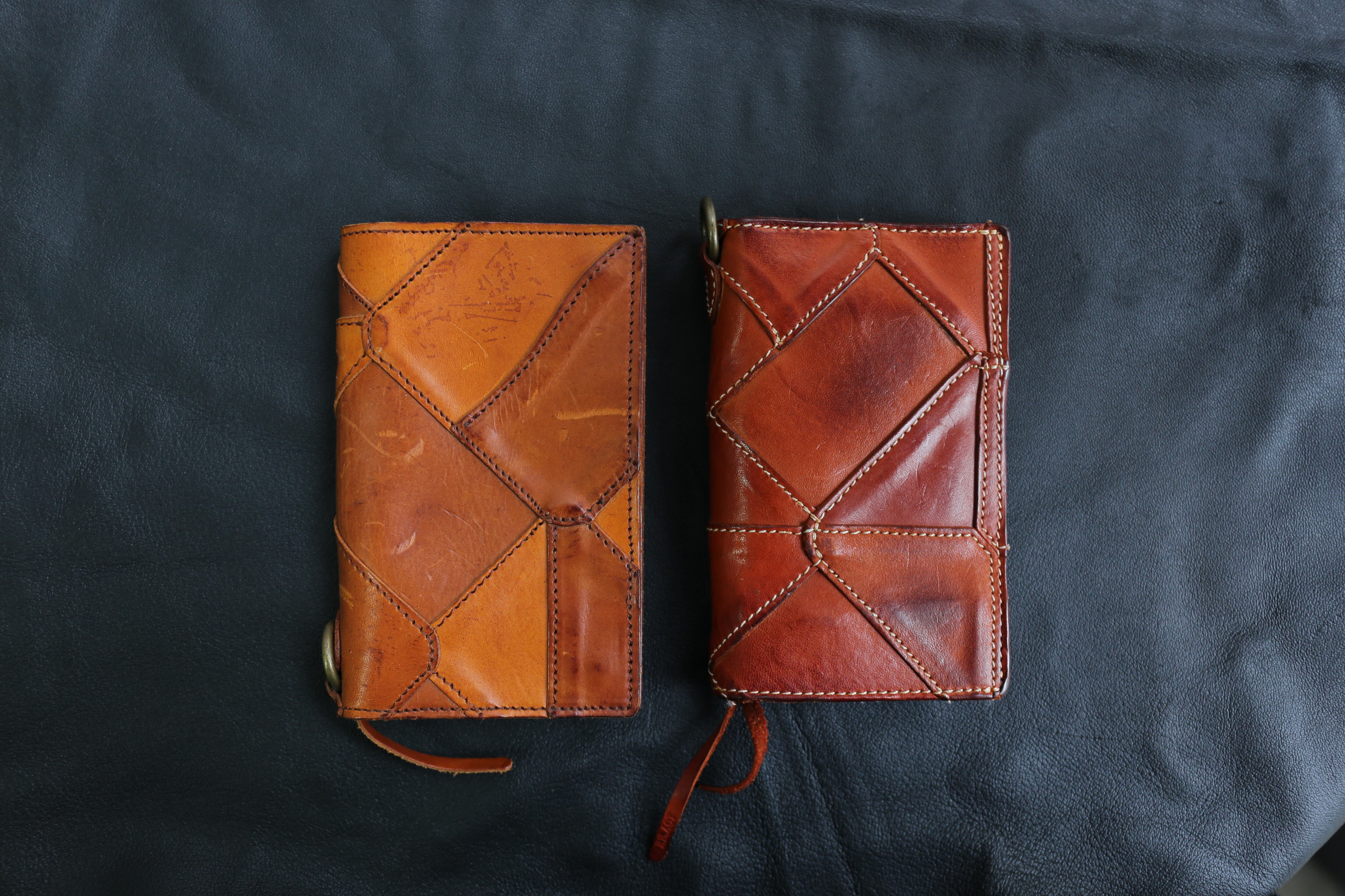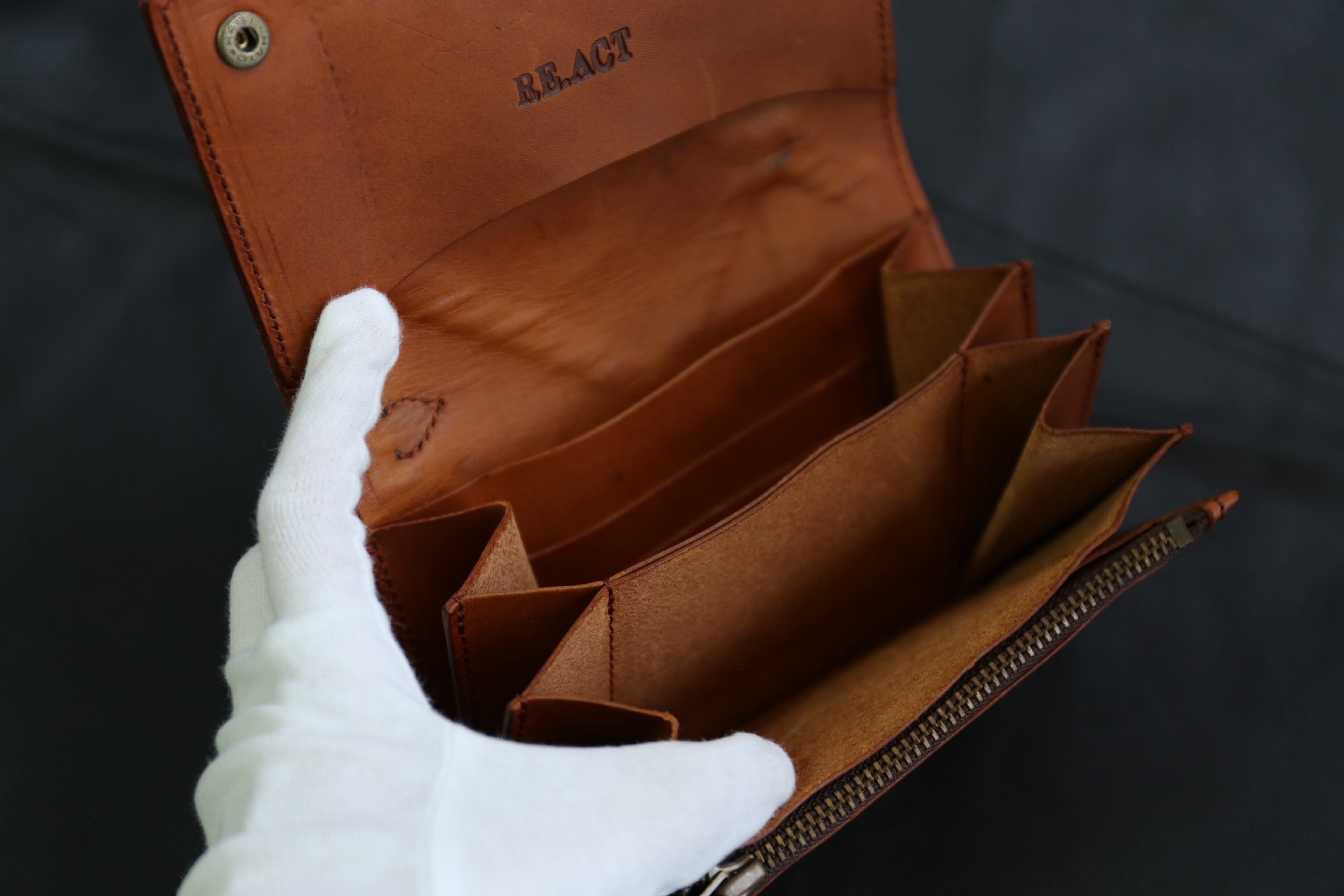 レザーがつぎはぎされた、テクニカルなレザー財布。2色ご用意があり、それぞれロゴのデザインも異なりますのでお好きな方をお選びください。