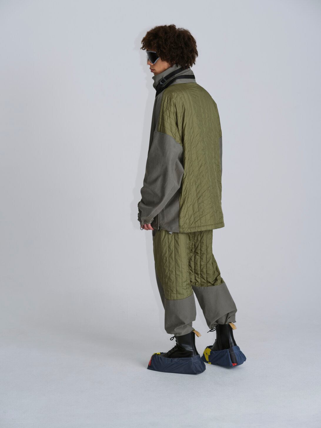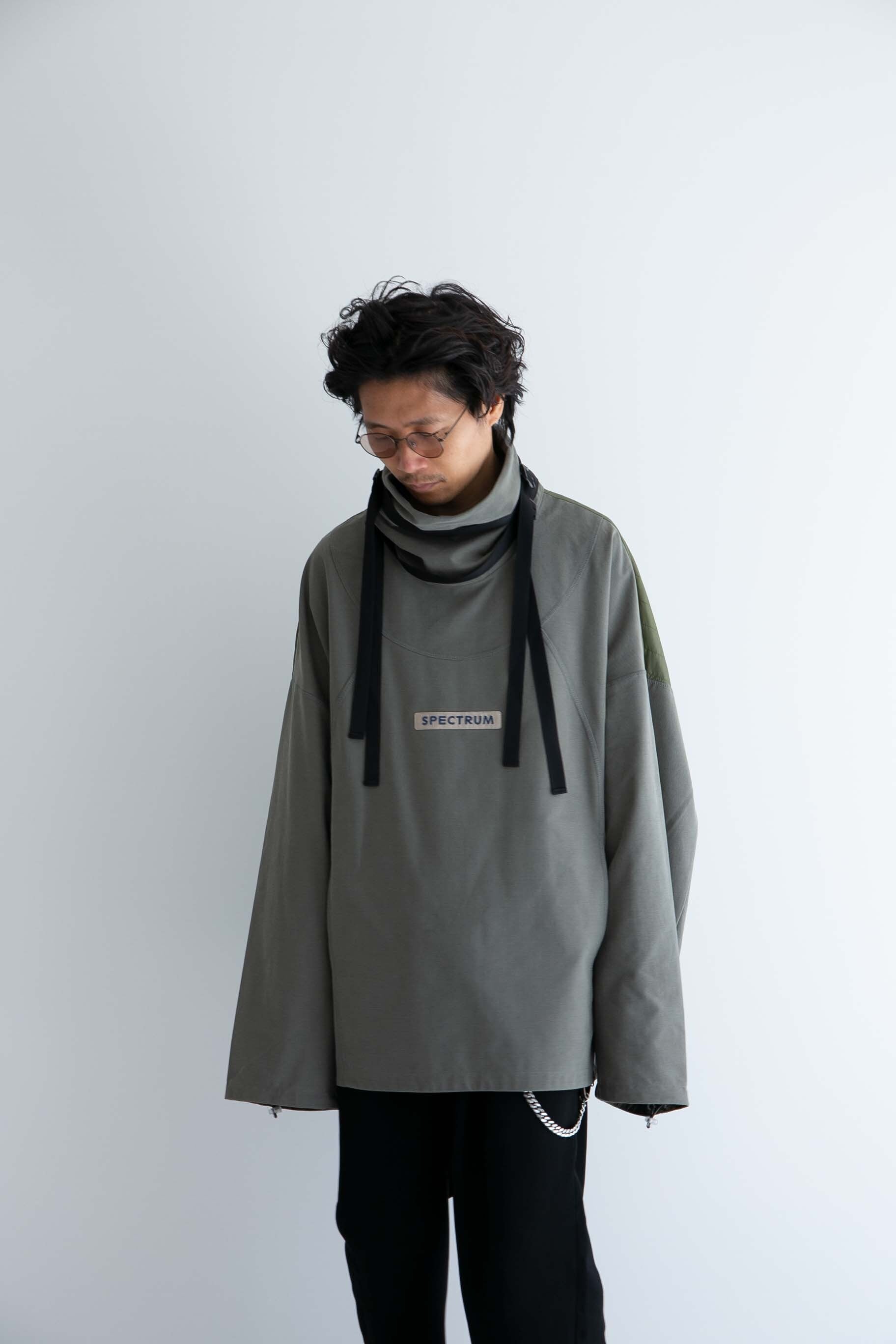 ミリタリーテイストのタートルネックプルオーバー。今期のA.A spectrumに多く見られるコードデザインがミリタリーにスポーティーさも加えています。サイドにチャックがついており、あげてスリットにすることができるので、ボトムスによって変形できるのもポイントです。背面のみ、中綿キルティングになっており、リモートワークなどで長時間椅子にもたれても痛くないようにという、デザイナーの意志が反映されています。