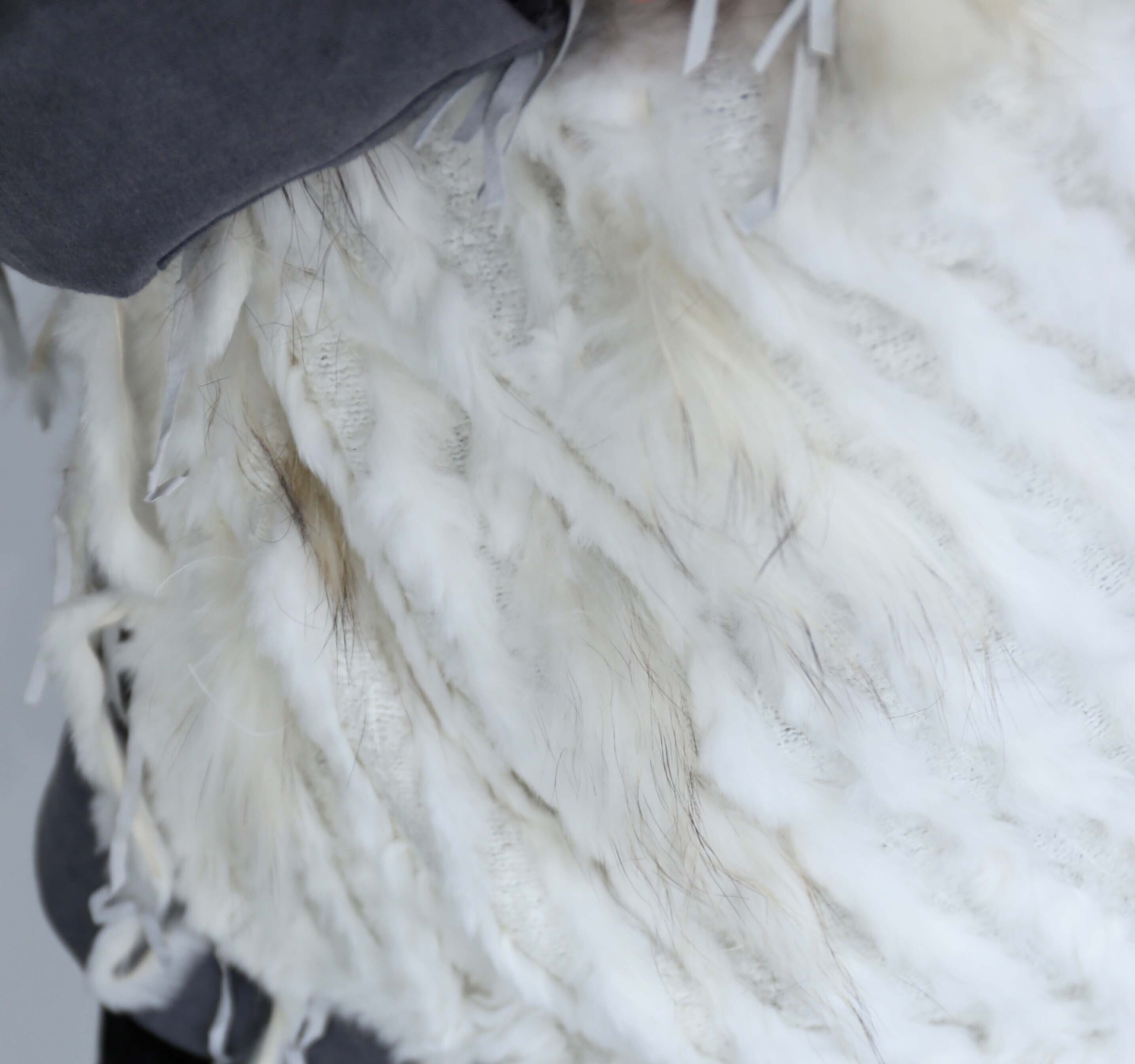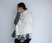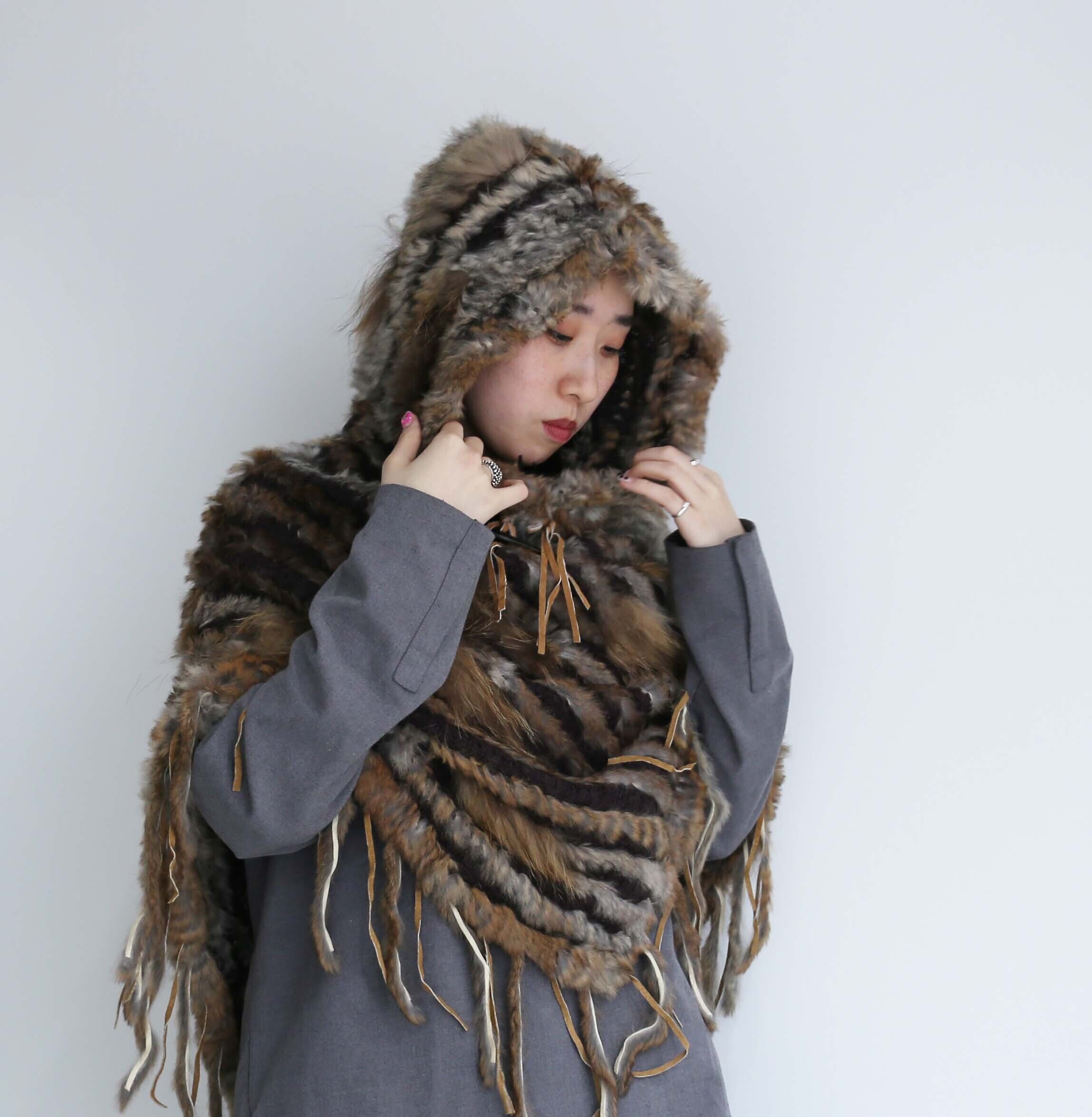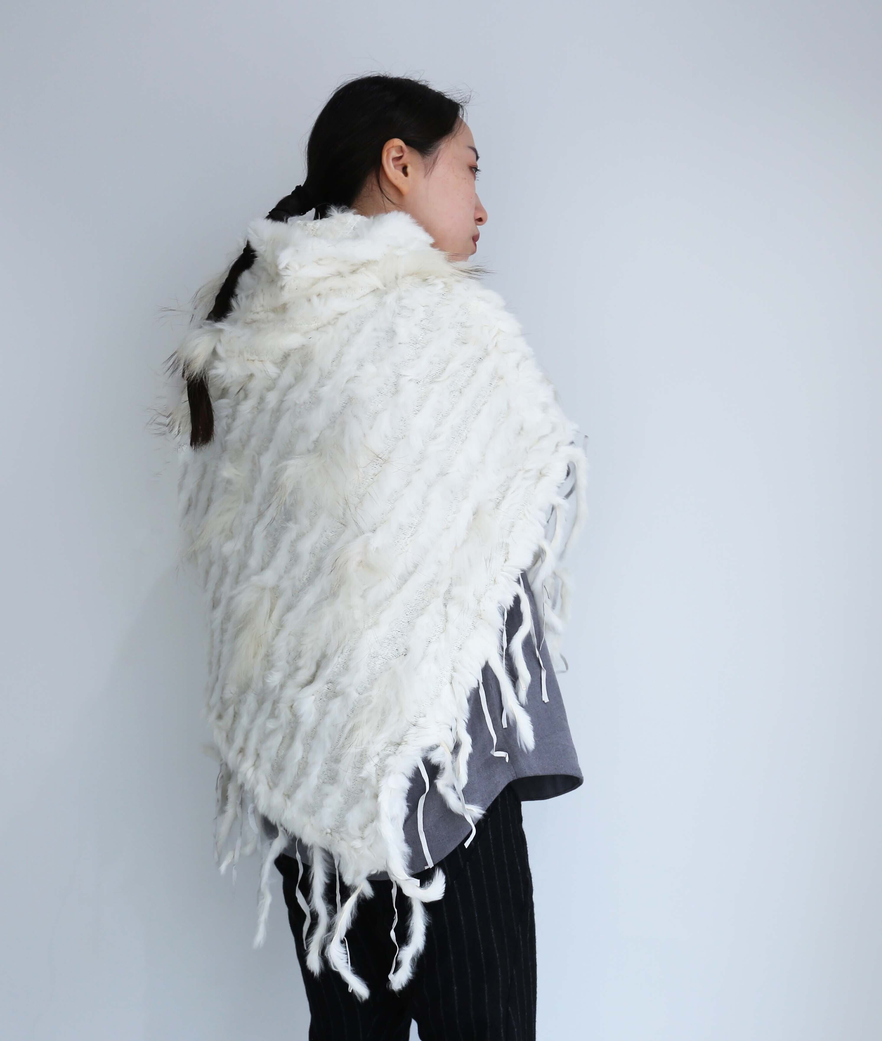 贅沢にラビット毛をあしらったポンチョ。とても暖かいのに軽く、フード付きポンチョなので被れば耳まで暖かい優れもの。裾にはフリンジがあしらわれており、デザイン性も程よくあります。コートの上やドレスの上など、使い方は様々です。